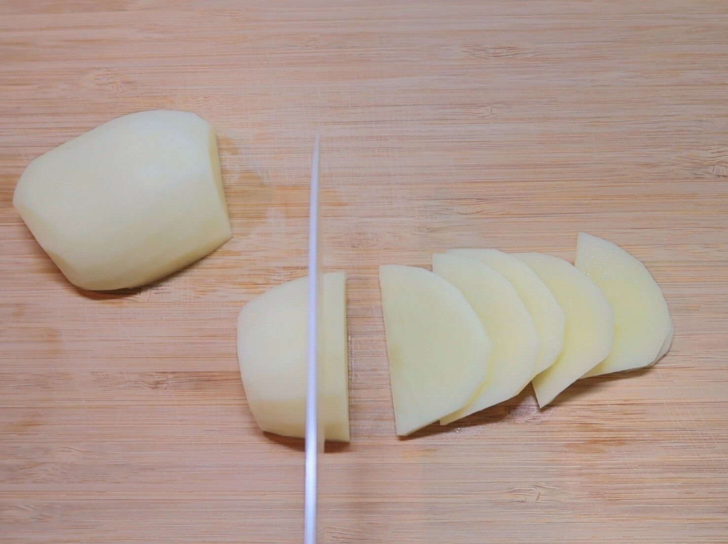 新じゃがいもは皮をむいて芽を取り除き、半分にカットします。つづいて切り口を下にして置き、約5mm幅のうす切りにします。