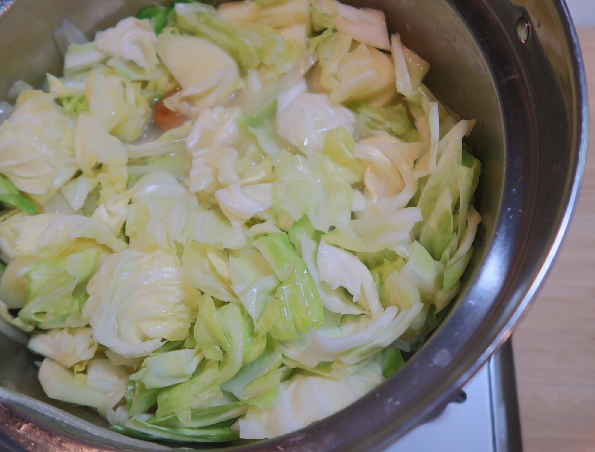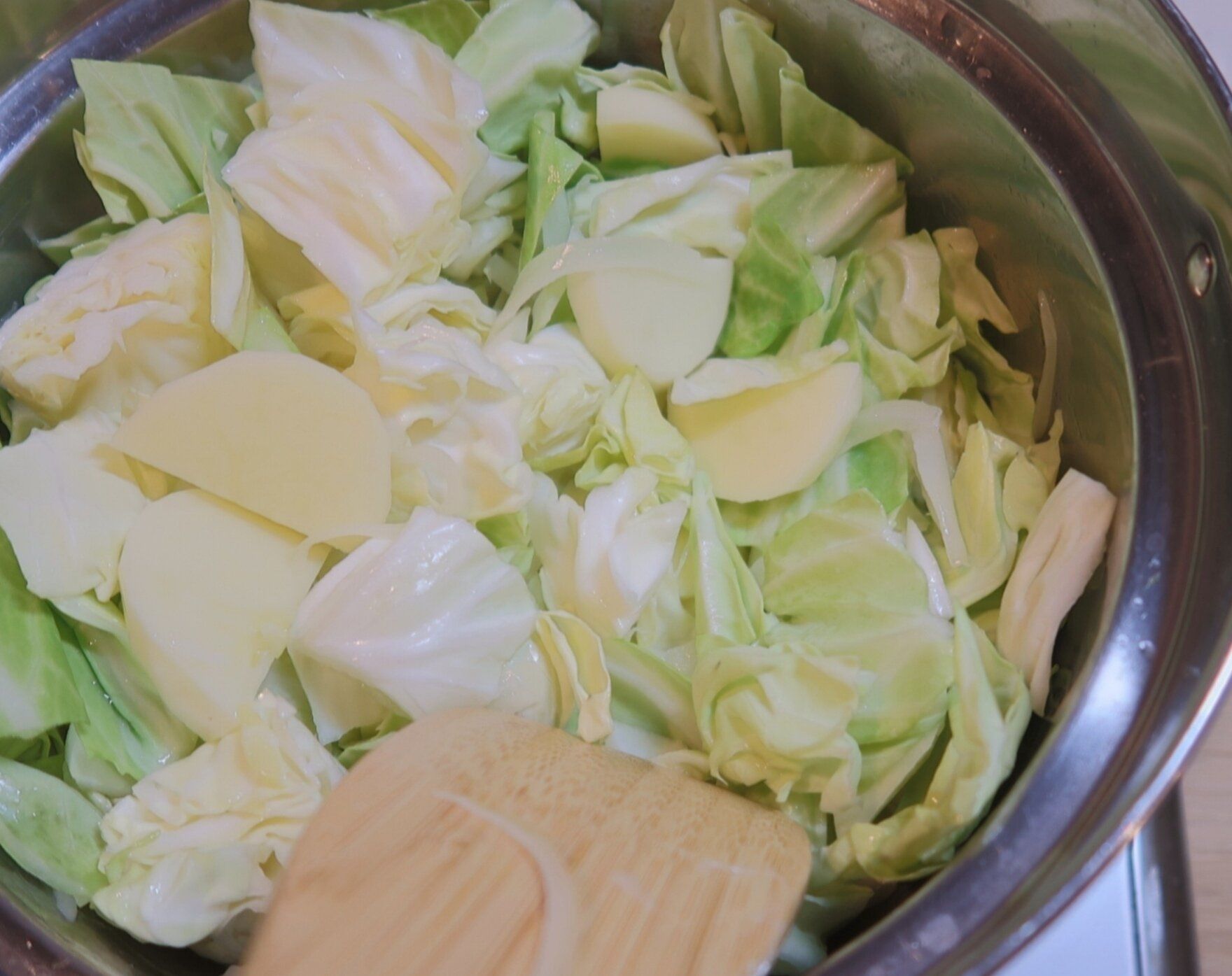 つづいて新じゃがいも、春キャベツを加えて全体を混ぜ合わせ、中火で約2分炒めます。