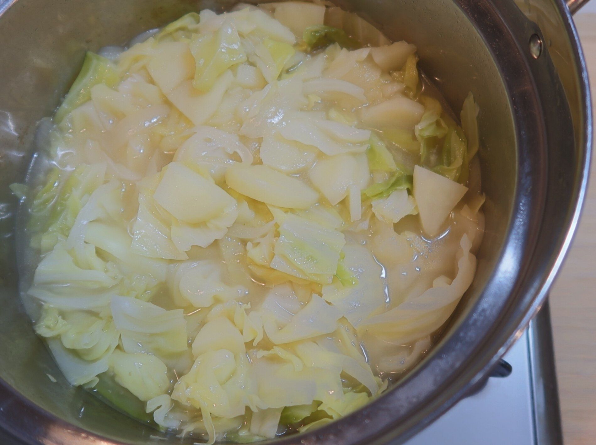 じっくり煮込むことで、野菜の水分を引き出します!じゃがいもがやわらかくなったら火を止め、あら熱をとります。