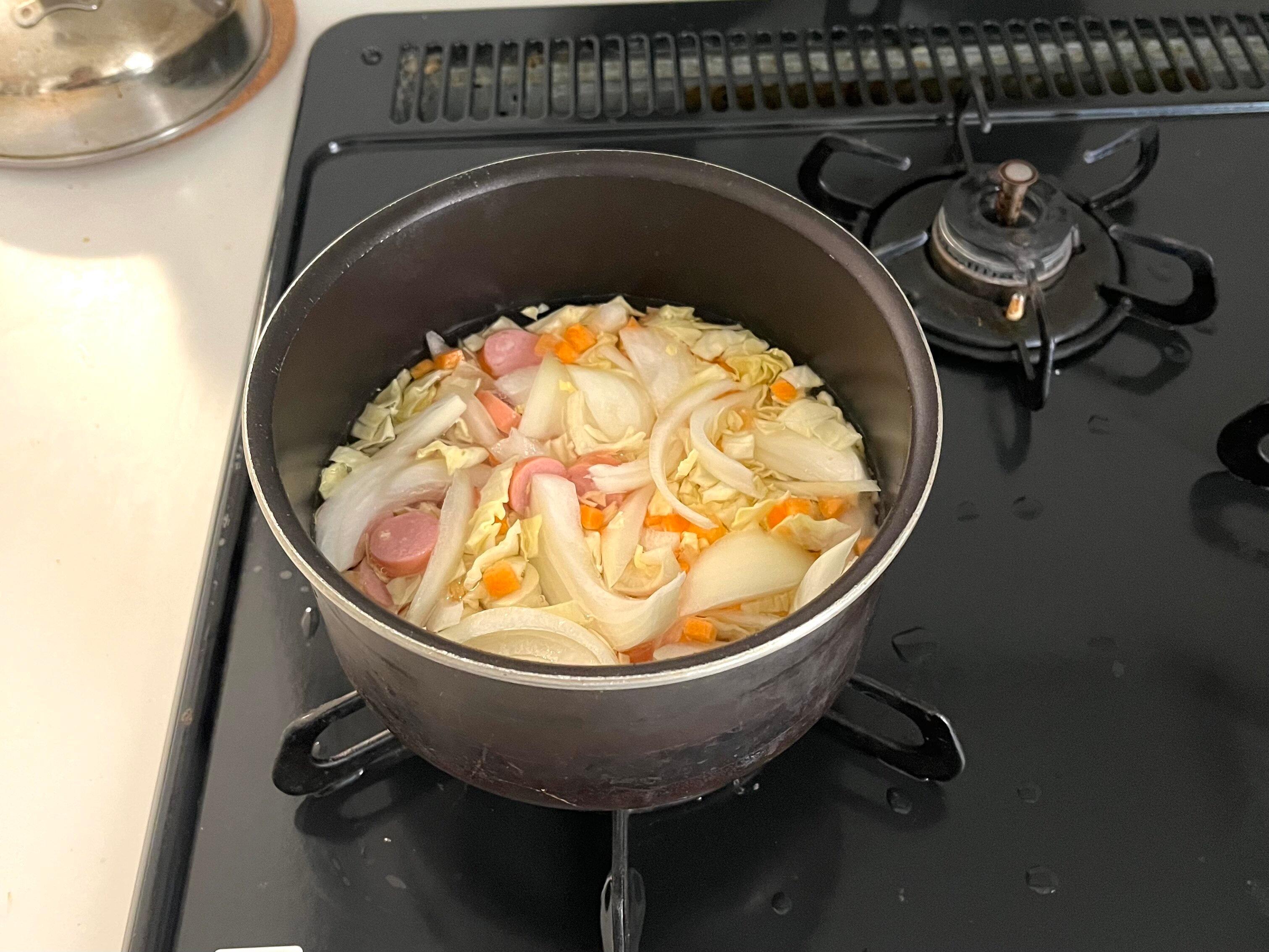 ・鍋に水と具材を入れ、具材がやわらかくなるまで煮込む