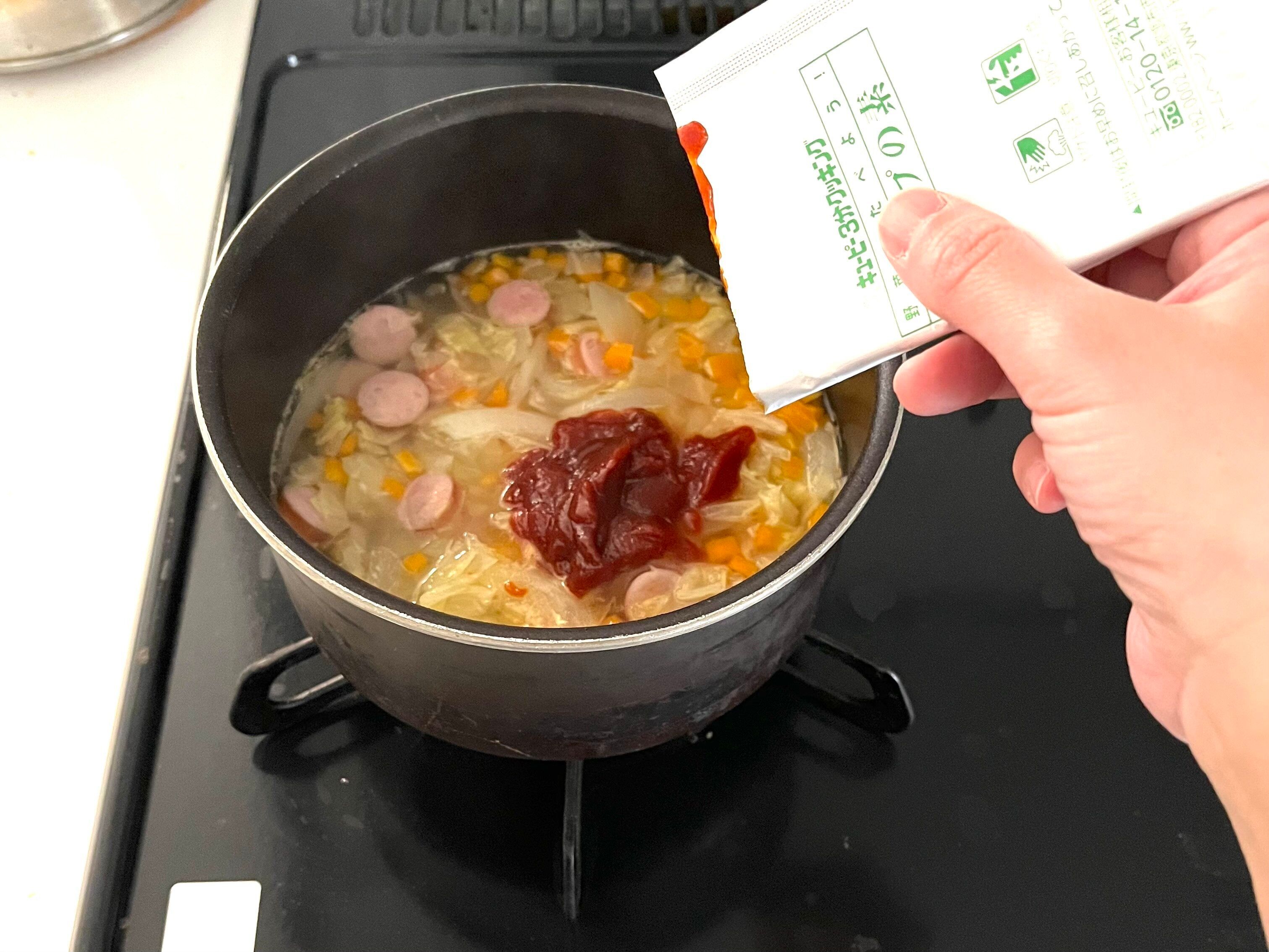 ・具材がやわらかくやったら、ミネストローネの素を入れる