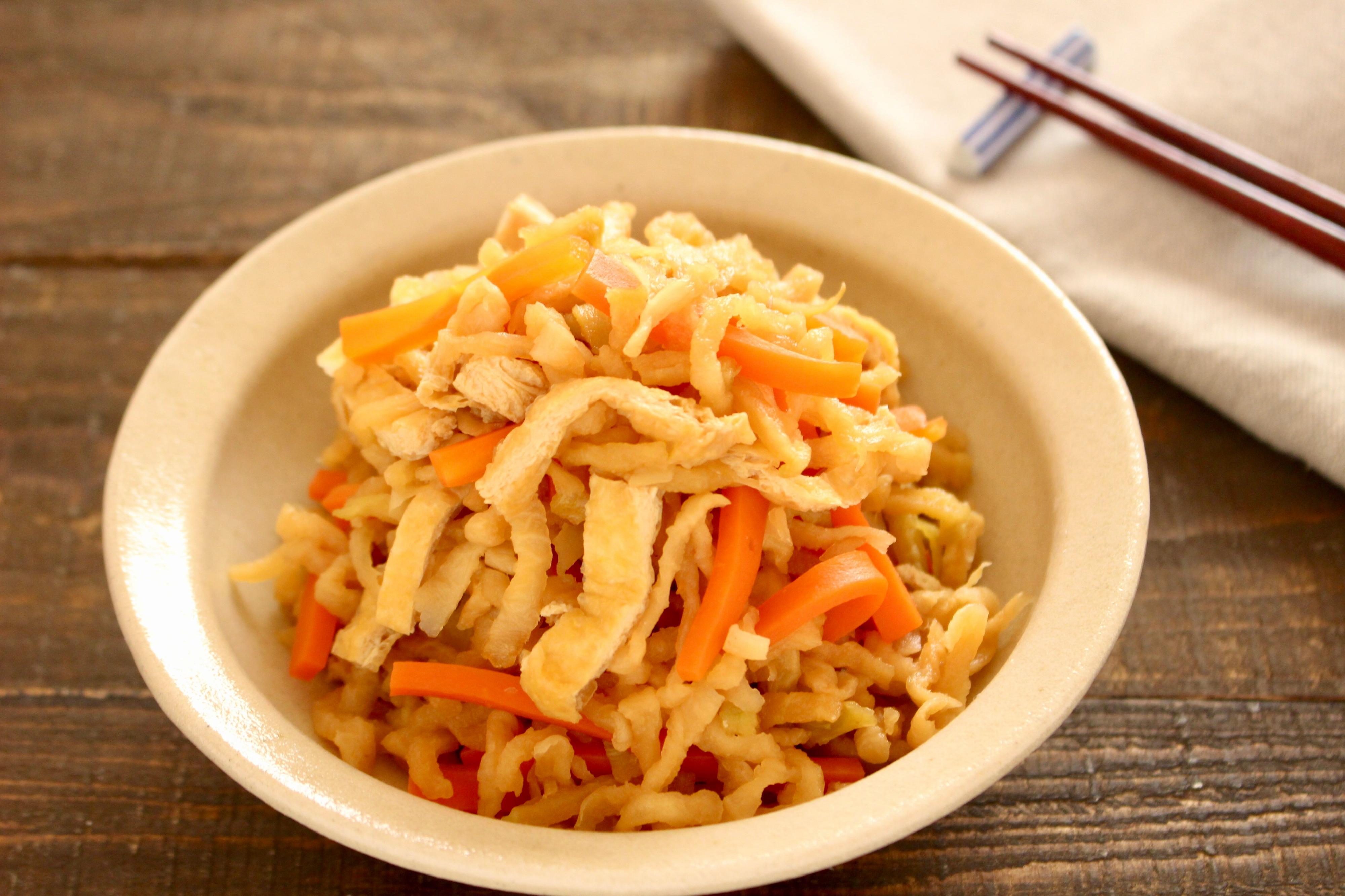 2.にんじんは拍子木切りにする。油揚げは短冊切りにする。