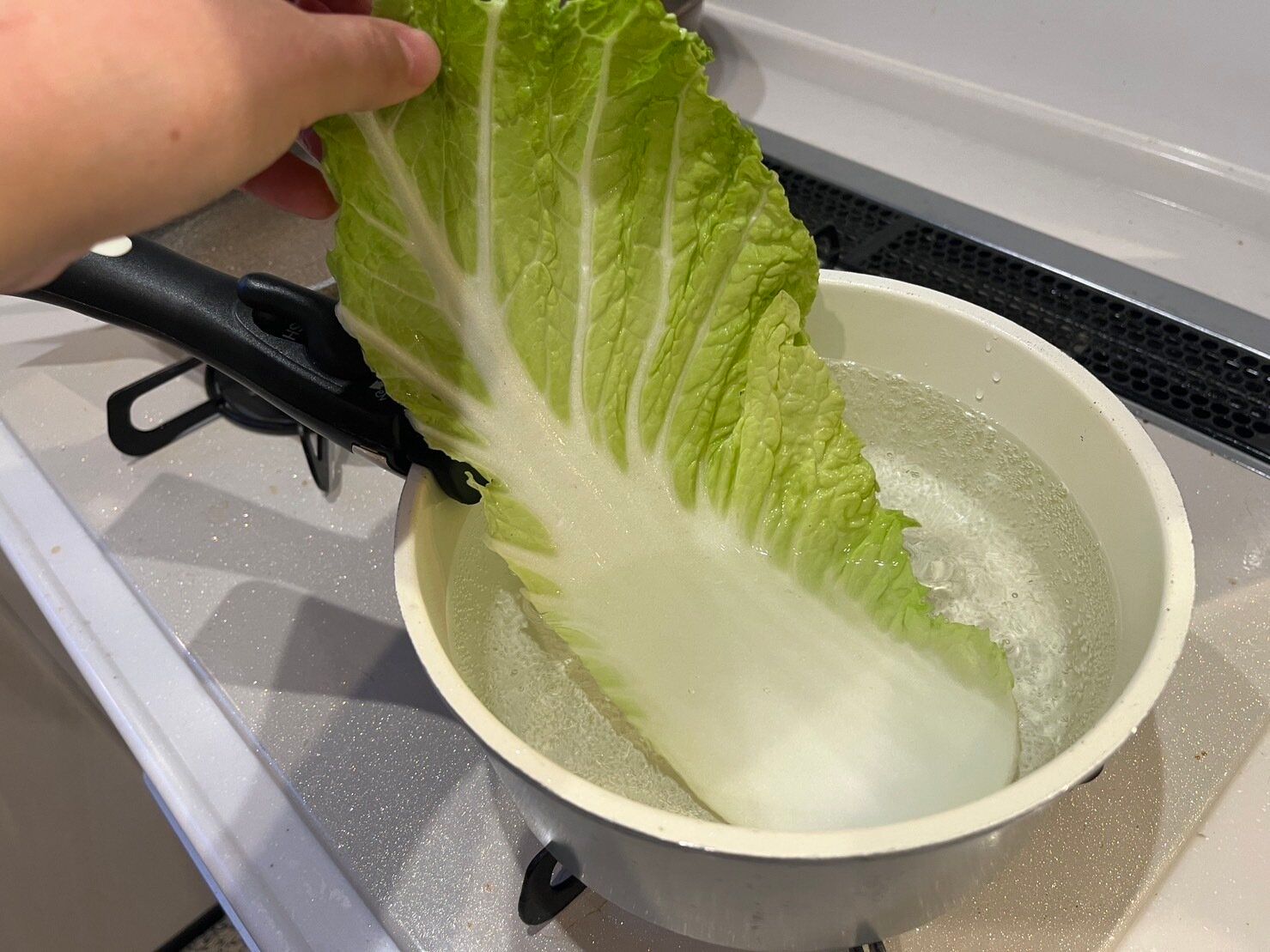 白菜の葉をはがして、1枚ずつクタクタになるまでゆでていきます。