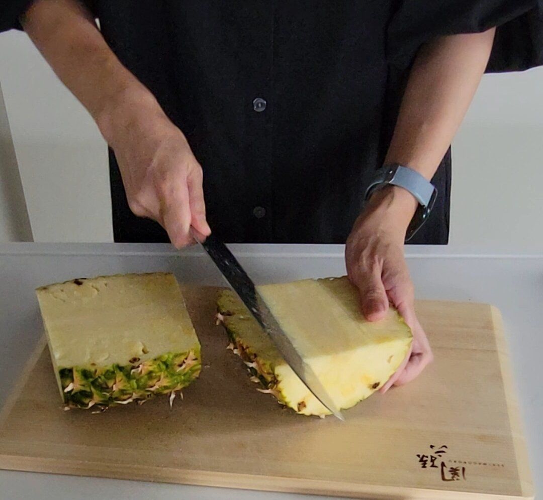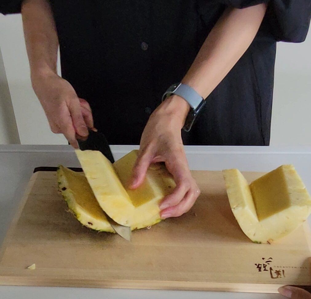 ちなみに、こちらはフィリピンパイナップルを使用していますが、今よく出回っている台湾パインは芯まで食べられるので、芯を取る必要がない分、更にカット数が減りもっと早く切ることができます。