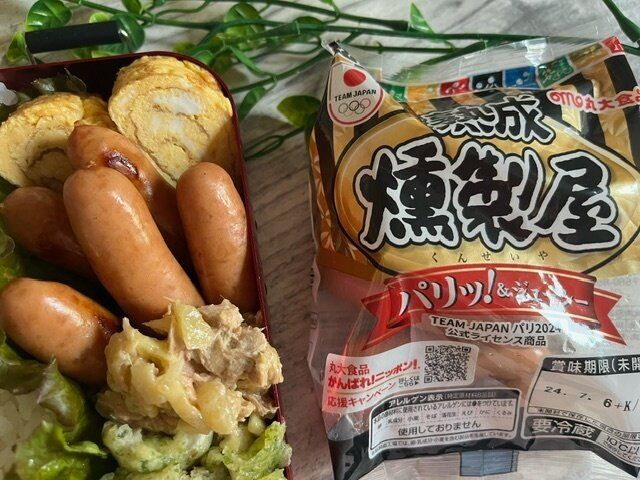 焼き上がったウインナーをお弁当に詰めました。さけることなくでも、表面のパリッと感が伝わってきます。
