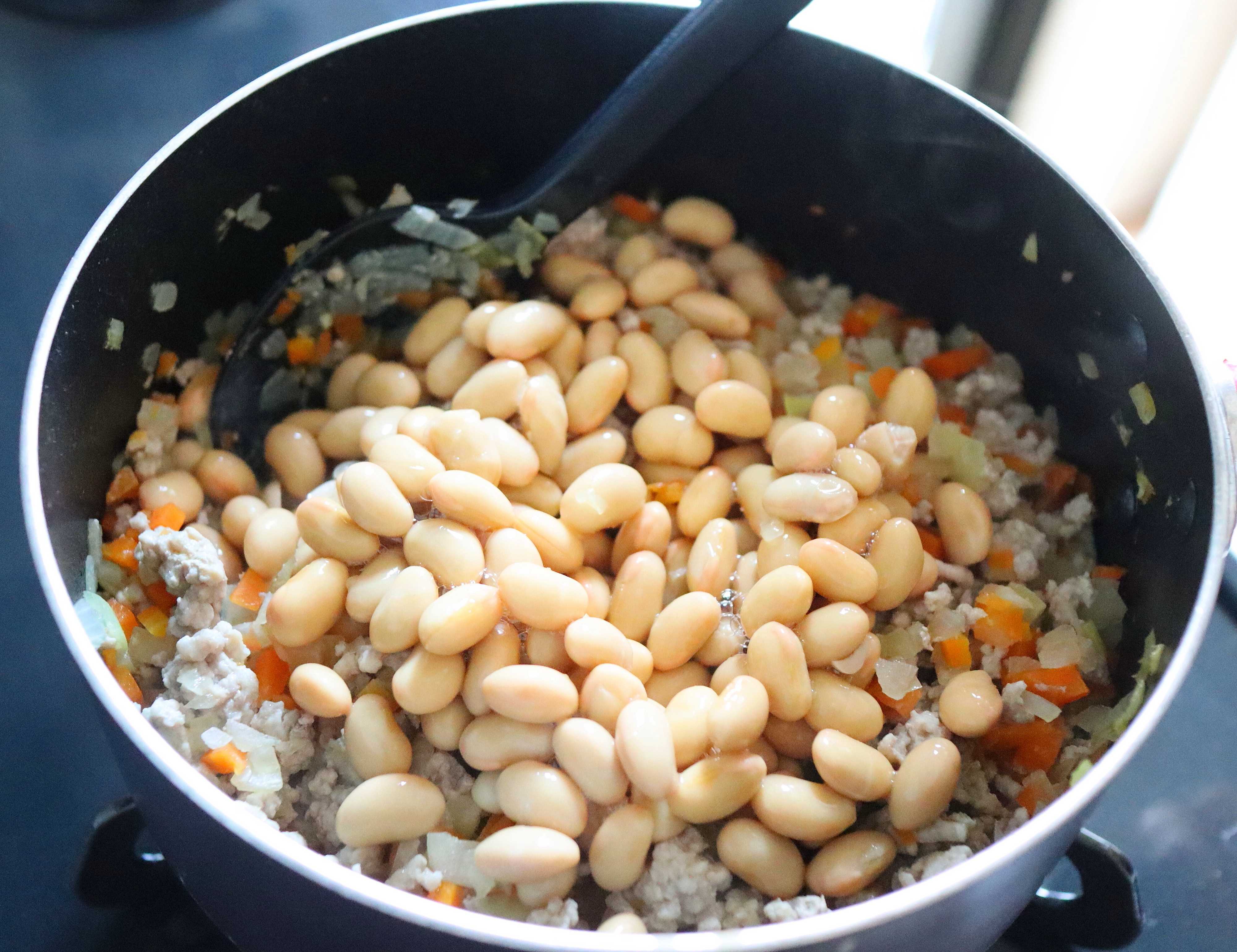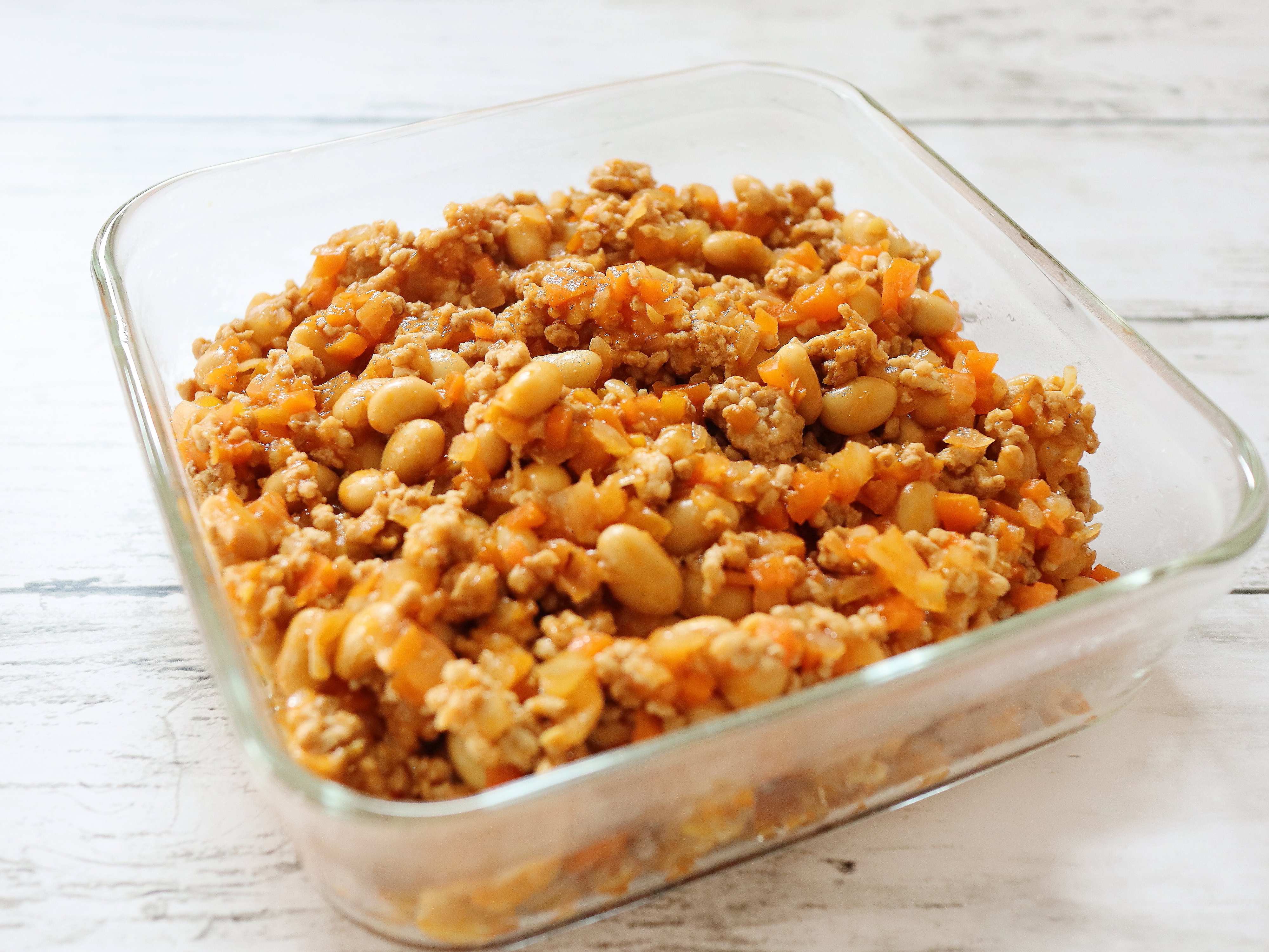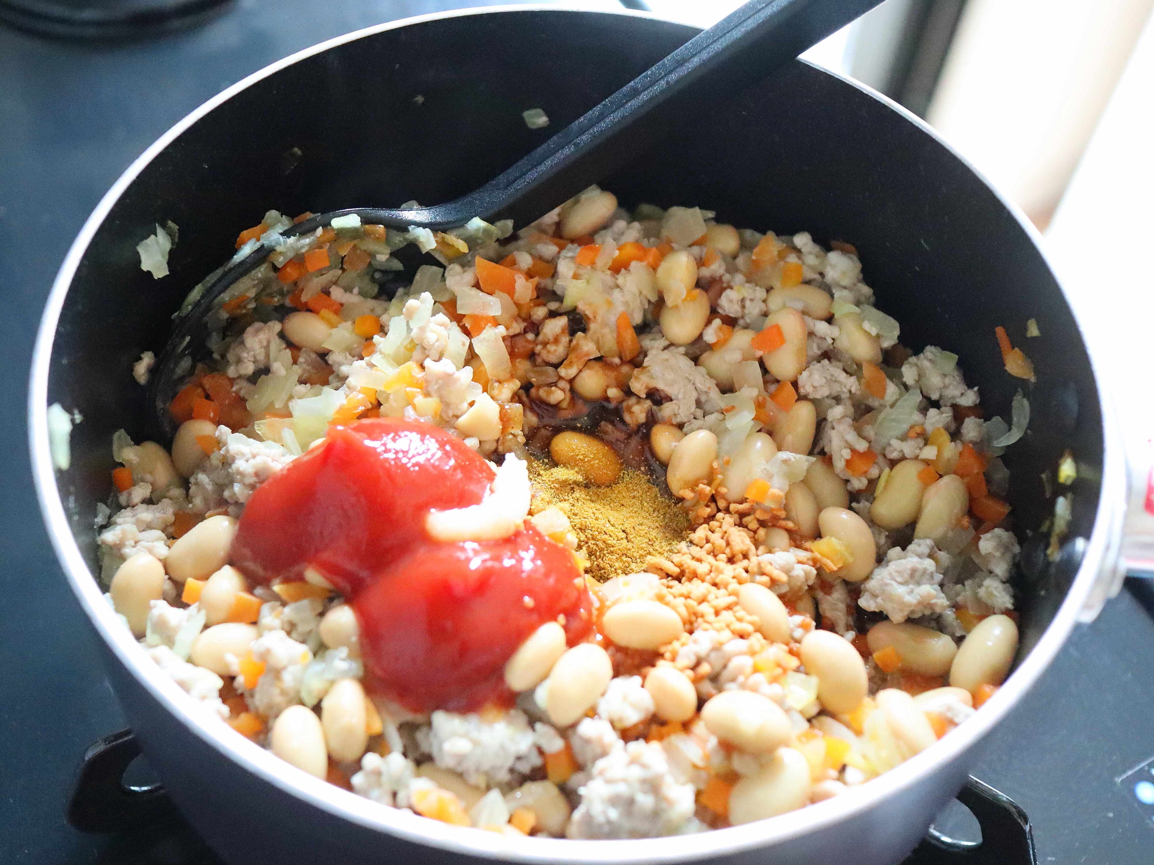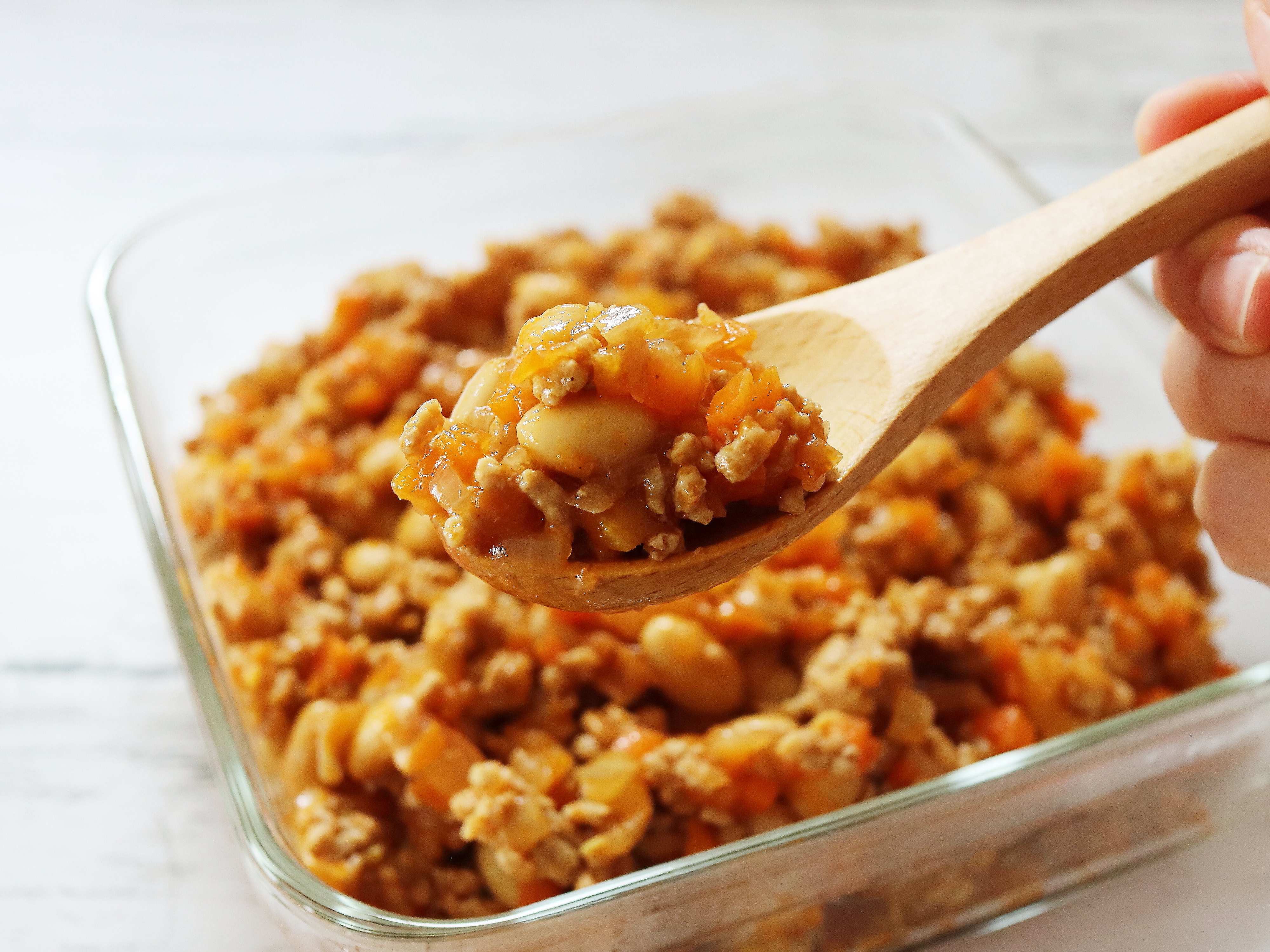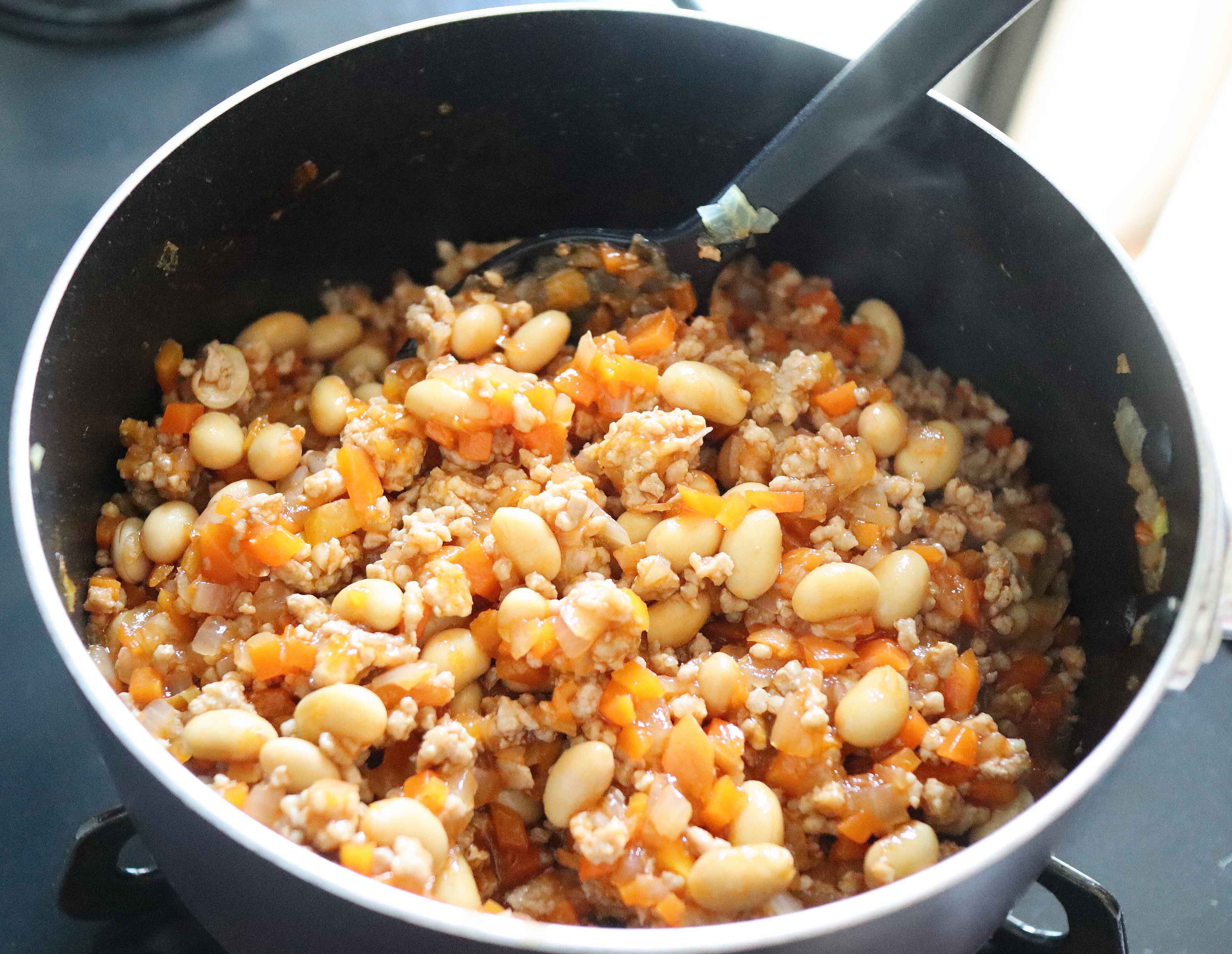 豚ひき肉、野菜、大豆を合わせてケチャップなどで味つけをするポークビーンズ。