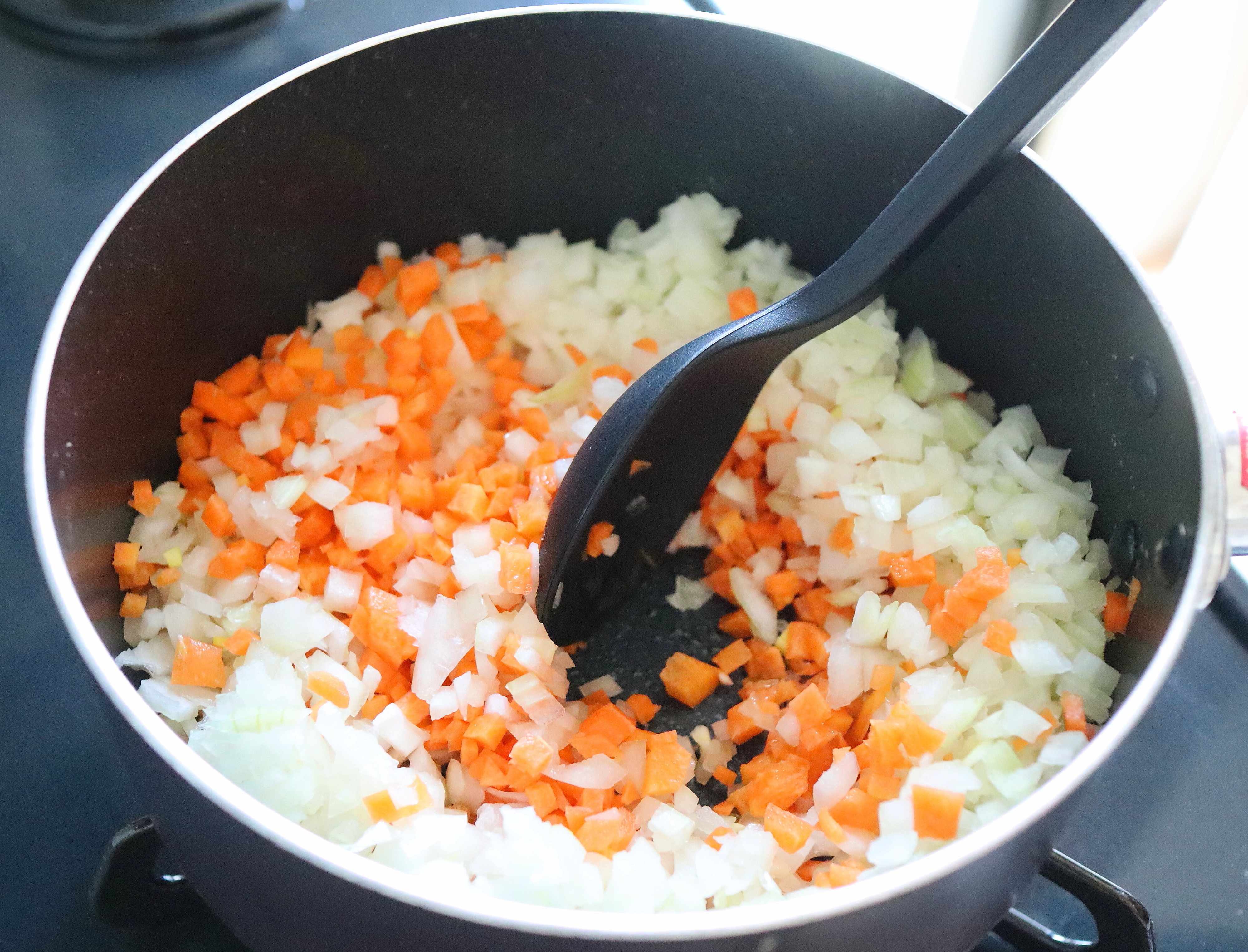 (2) 鍋にサラダ油を熱し、たまねぎとにんじんを炒める。