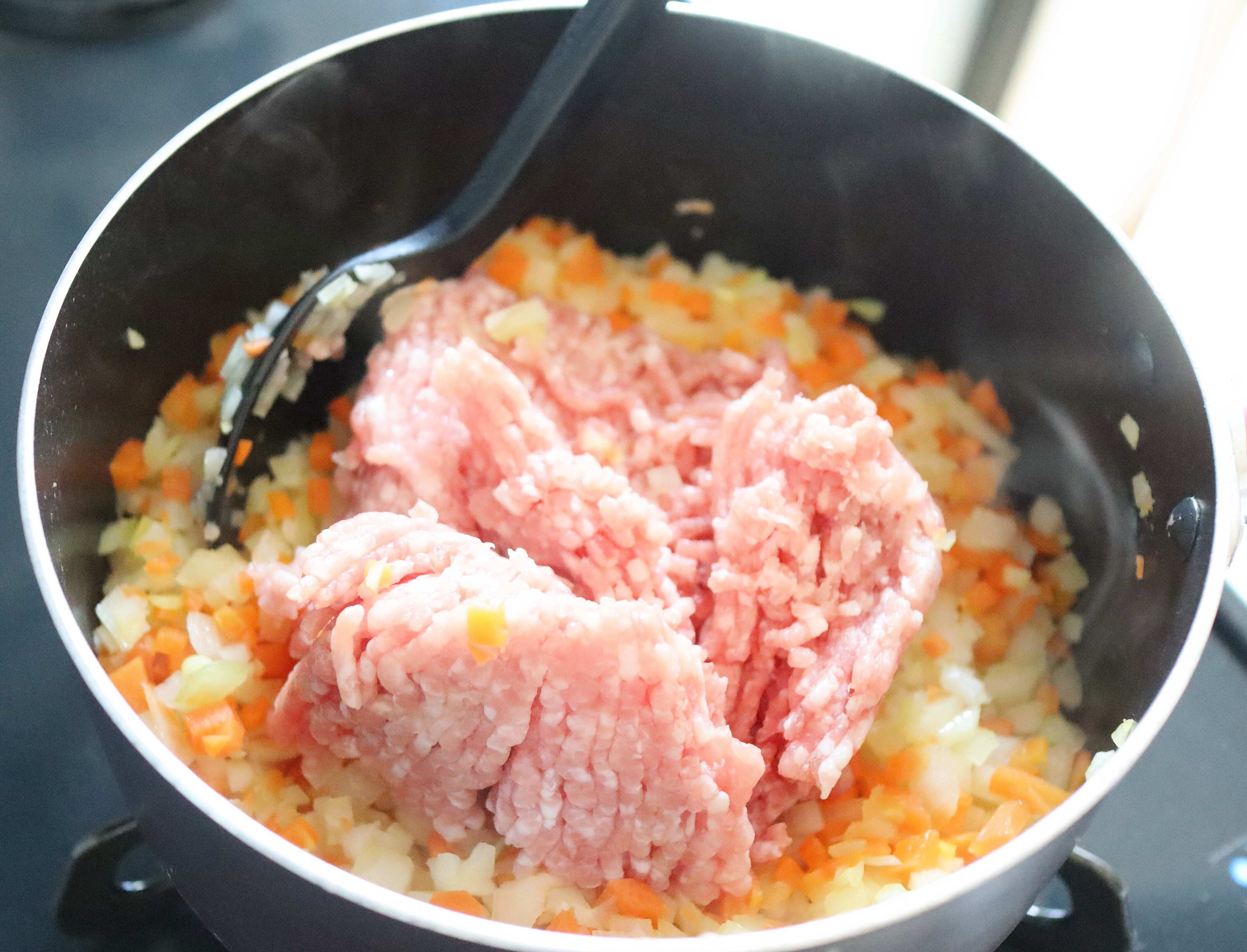 (3) 野菜が少ししんなりしたら、豚ひき肉を加える。