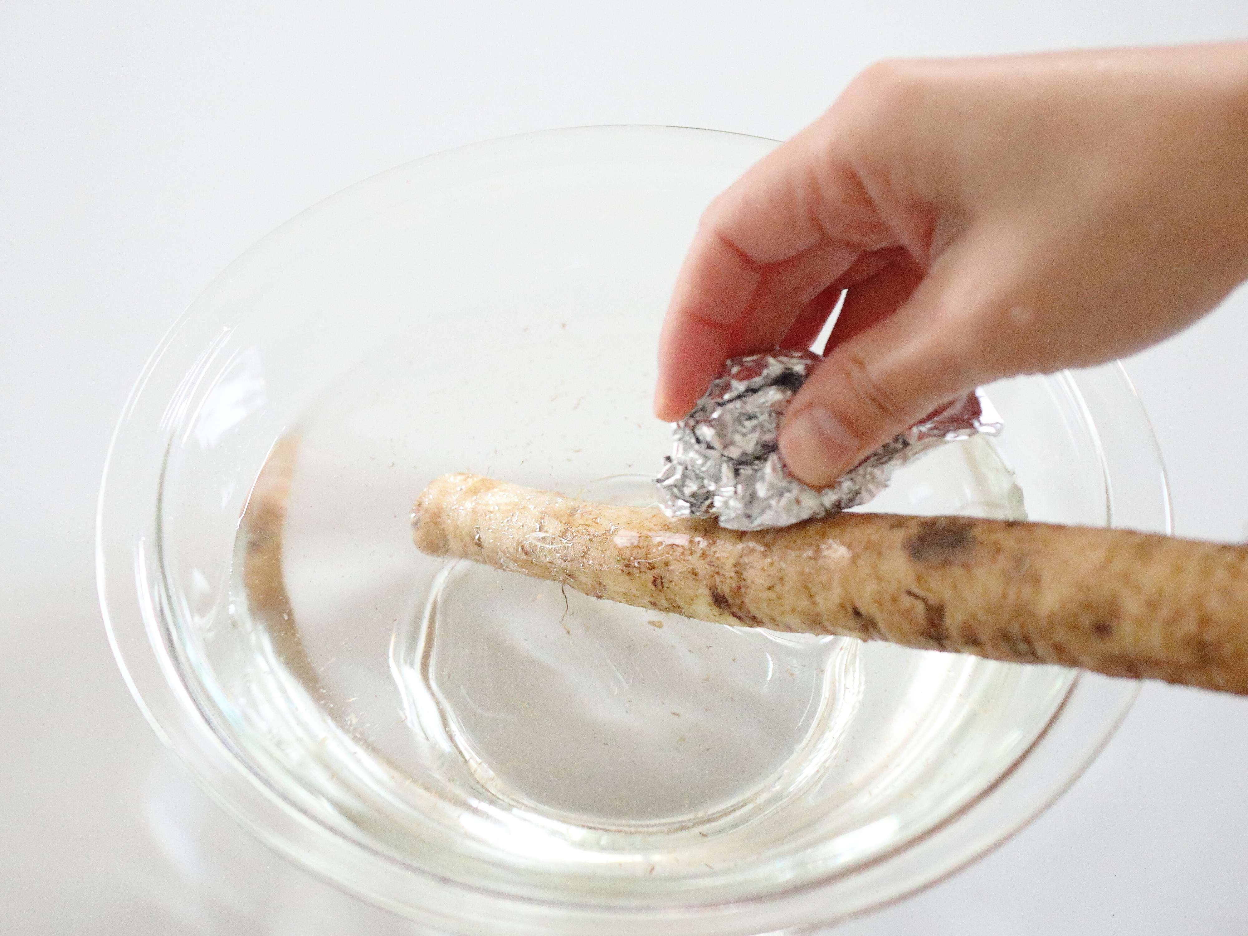 ごぼうは土がついているため、しっかり洗って皮をむいて使うかたも多いのでは?ごぼうの皮にはポリフェノールが多く含まれ、旨みや香りがたっぷりなので、むいてしまってはもったいないのです。丸めたアルミホイルで、表面の土や汚れを落とすのがおすすめ。