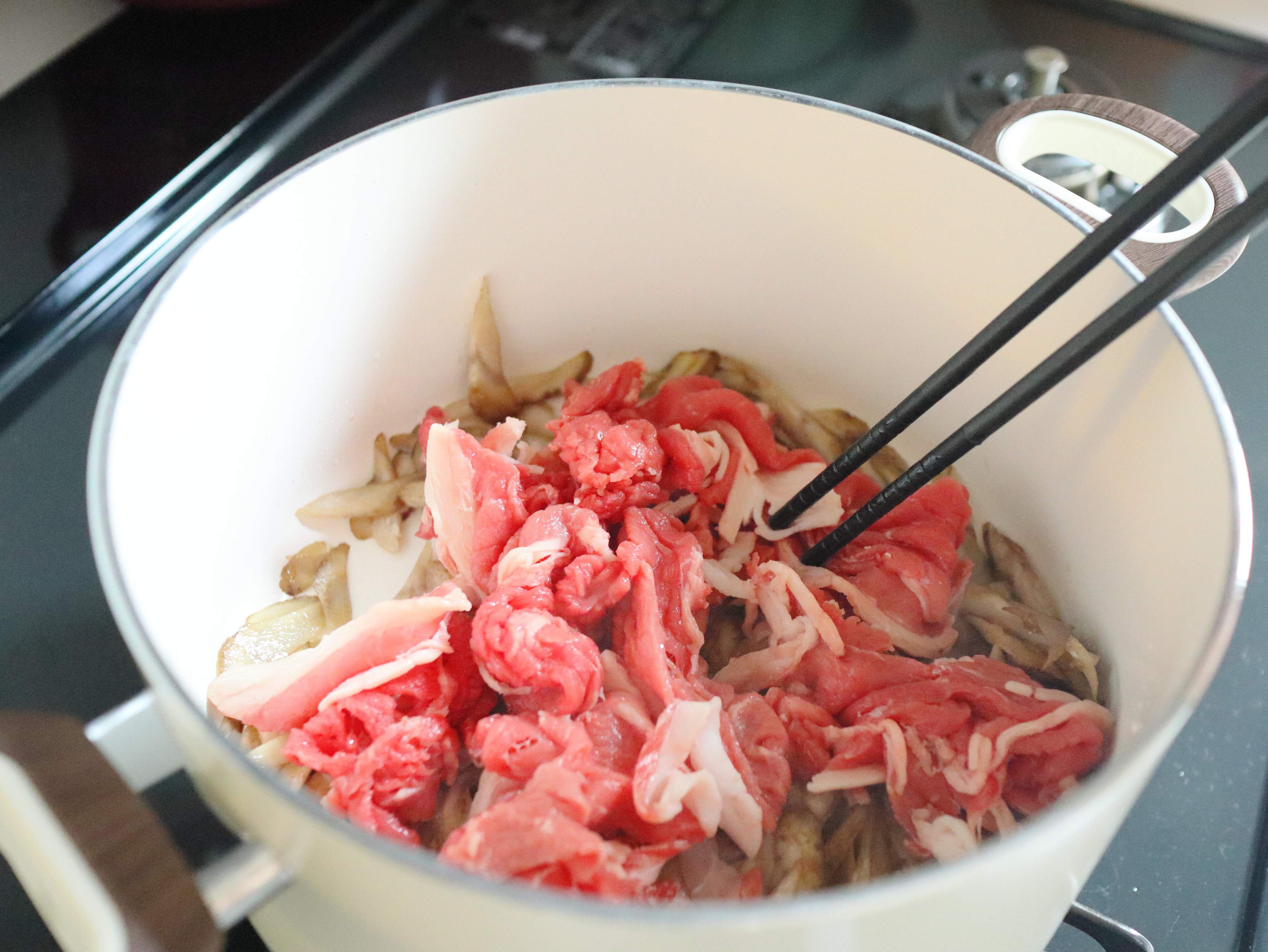 (3) 鍋にサラダ油を熱しごぼうを炒め、油がまわったら牛肉を加えて炒め合わせる。