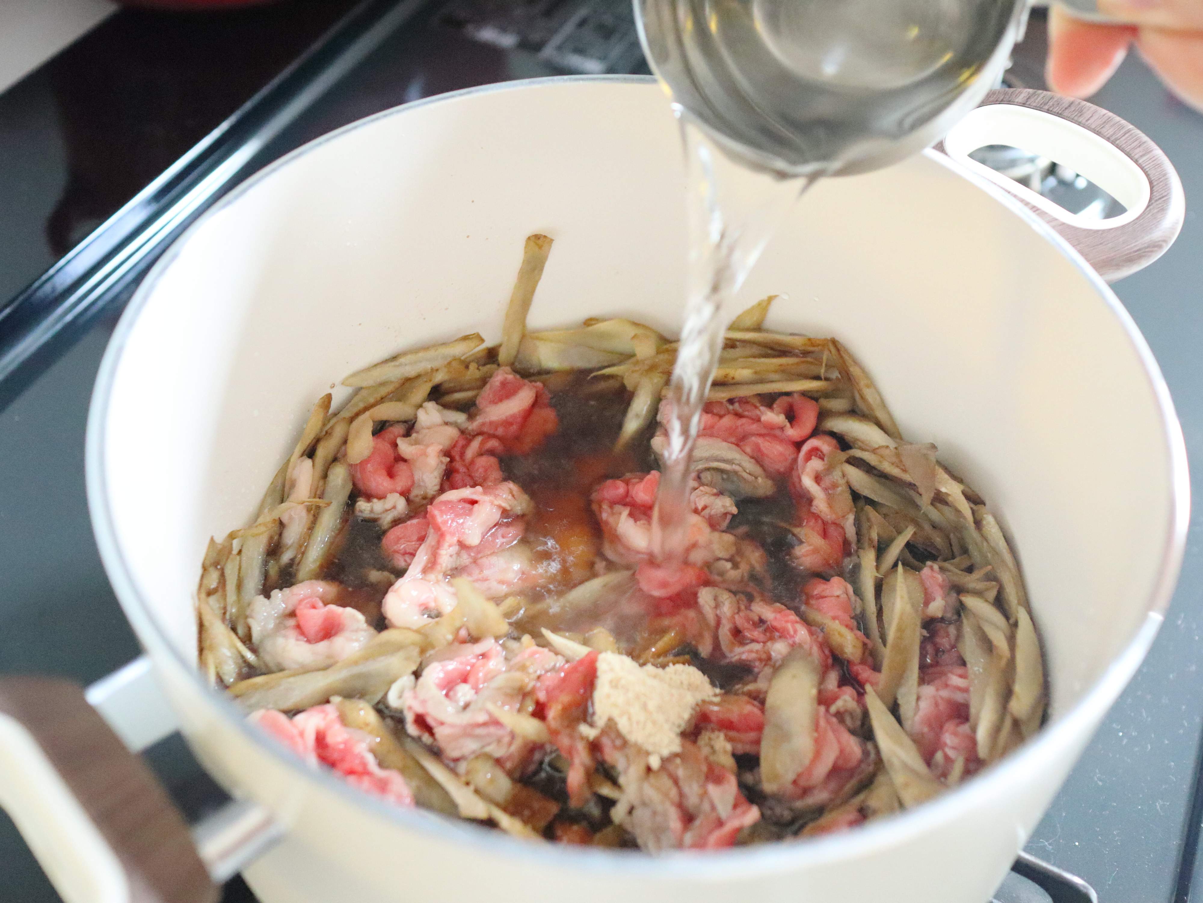 (4) 牛肉の色が変わり始めたら、★の材料を加え、煮立たせる。