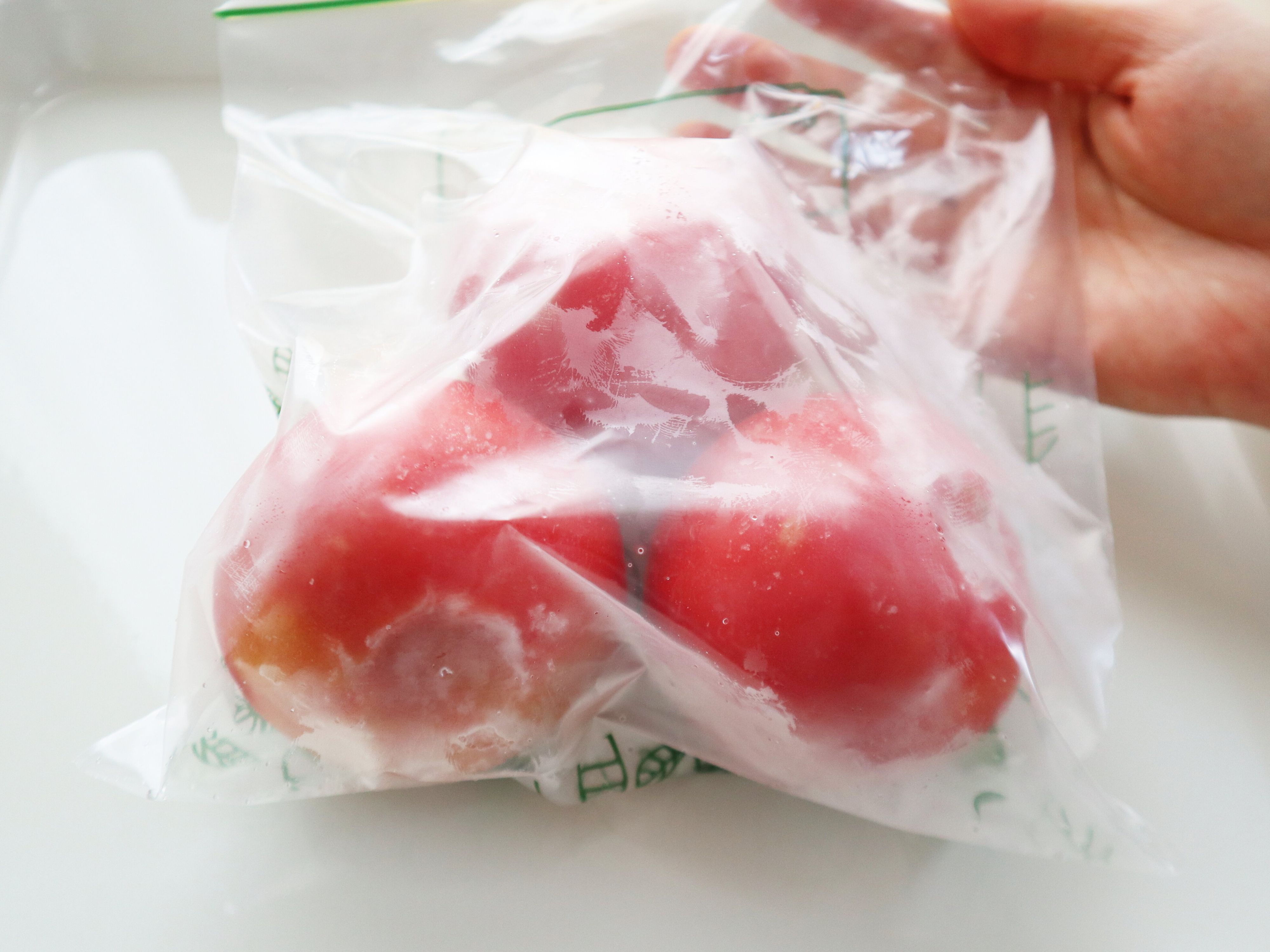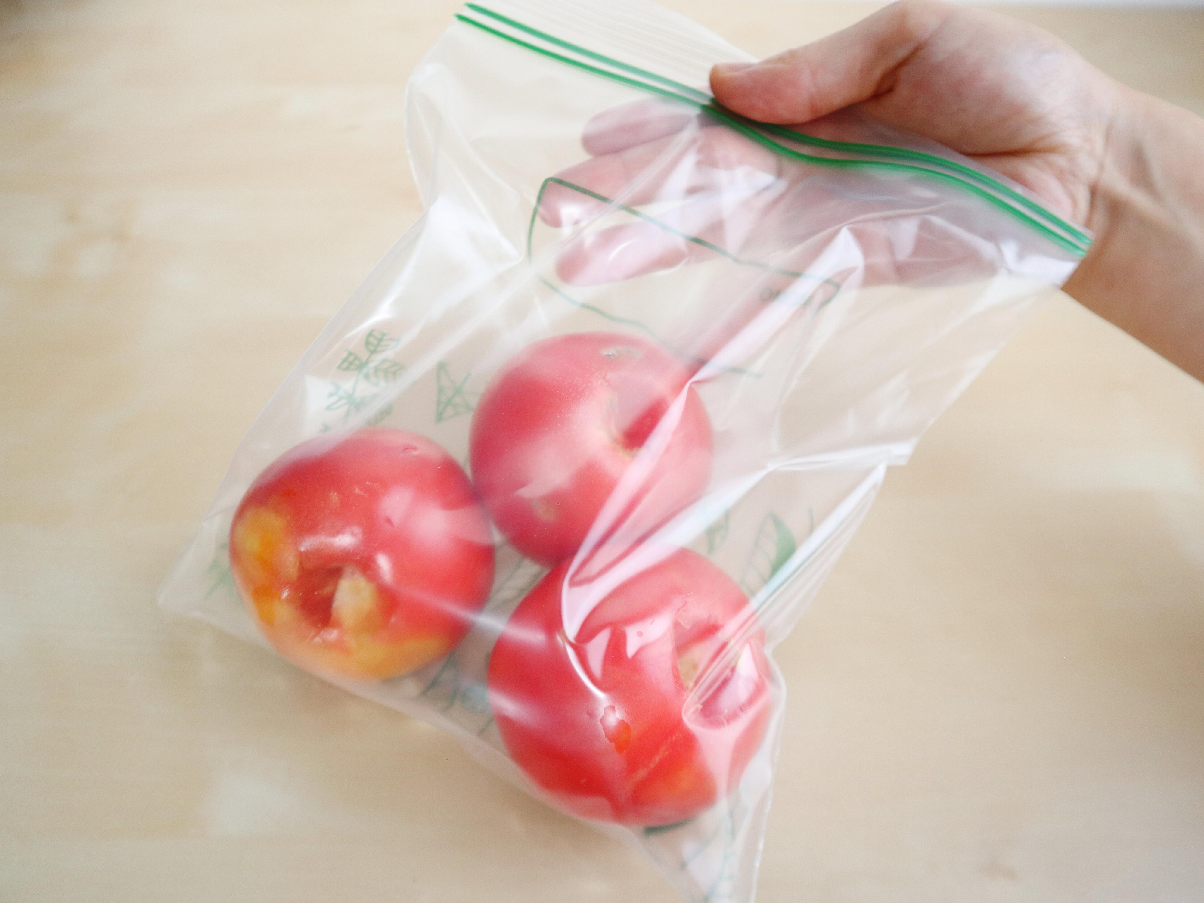 (1) トマトは洗ってヘタを取ったら、ジッパーつき保存袋に入れ冷凍庫で凍らせる。