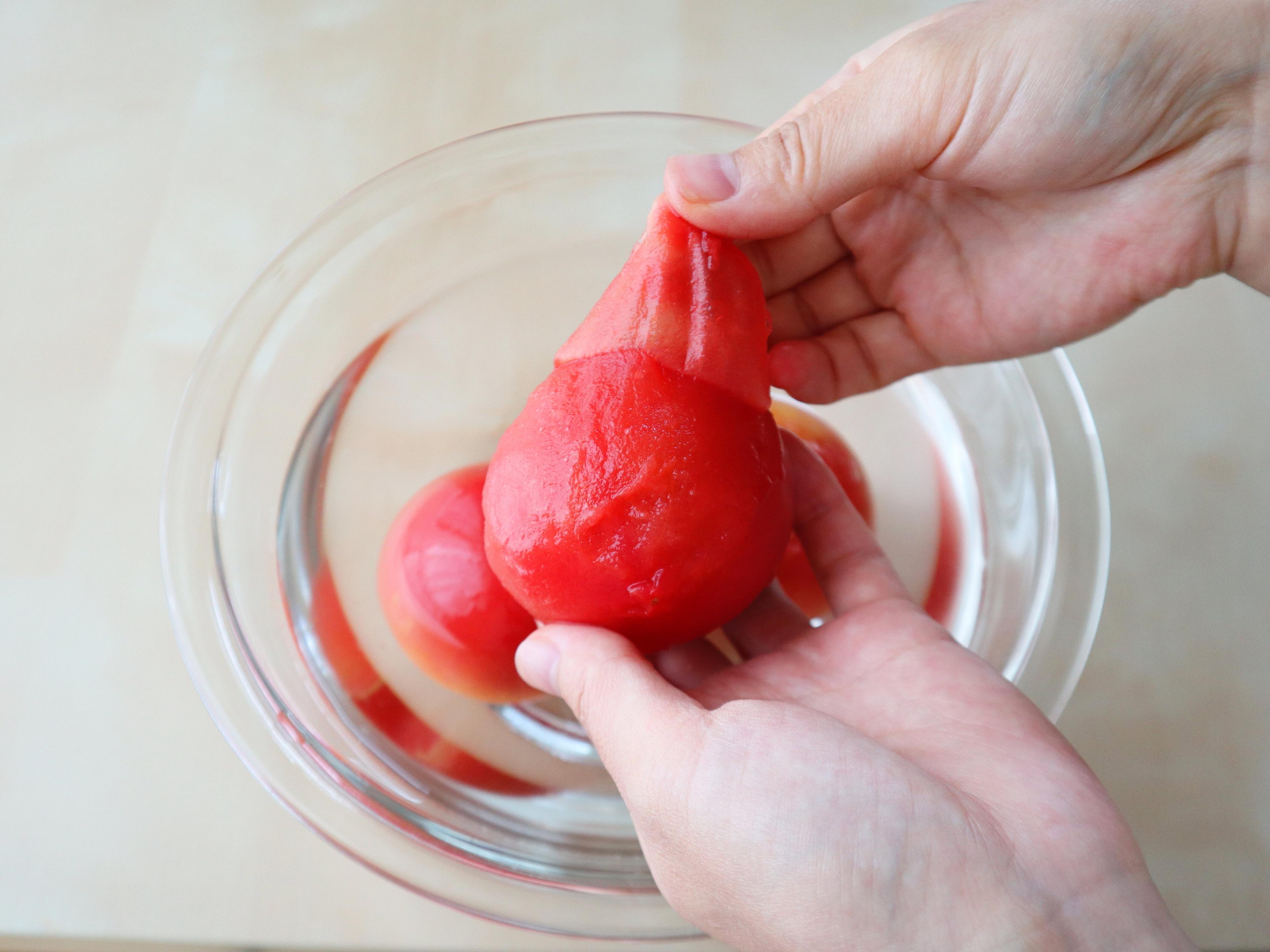 (2) 水を入れたボウルに凍ったトマトを入れ、皮をむく。