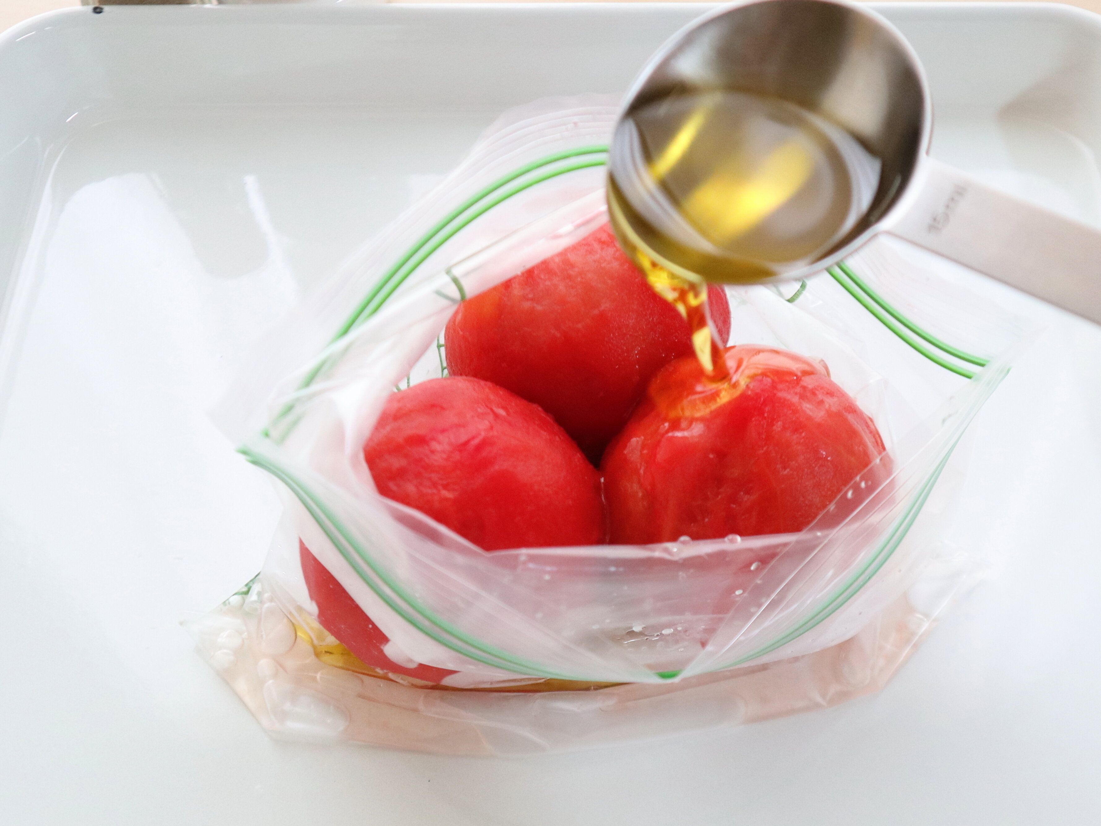 (3) 皮をむいたトマトを保存袋に戻し、オリーブオイル、塩、こしょうを入れる。