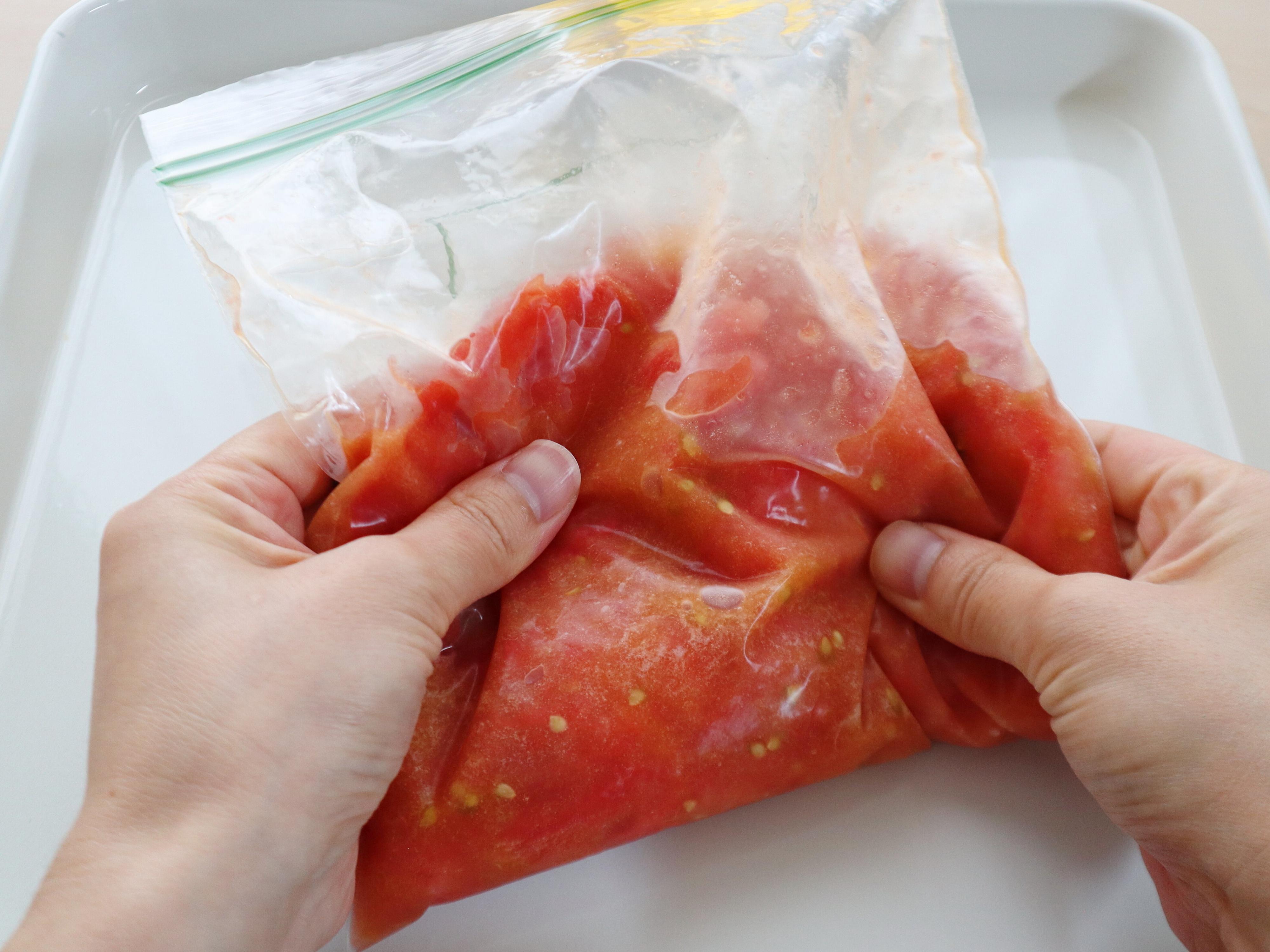 このレシピは、トマトを丸ごと冷凍してから使います。