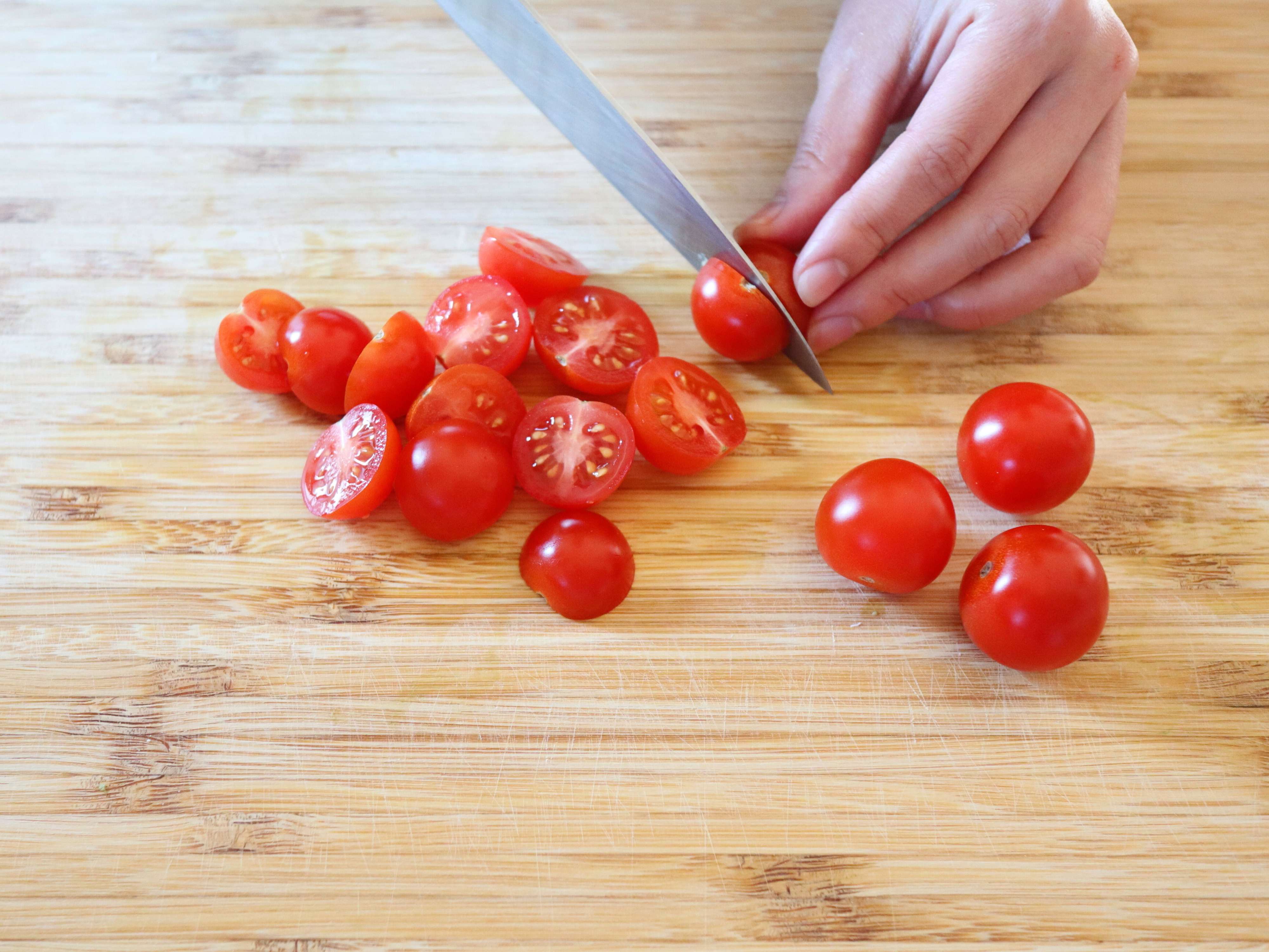 (1) ミニトマトはヘタを取り、半分にカットする。