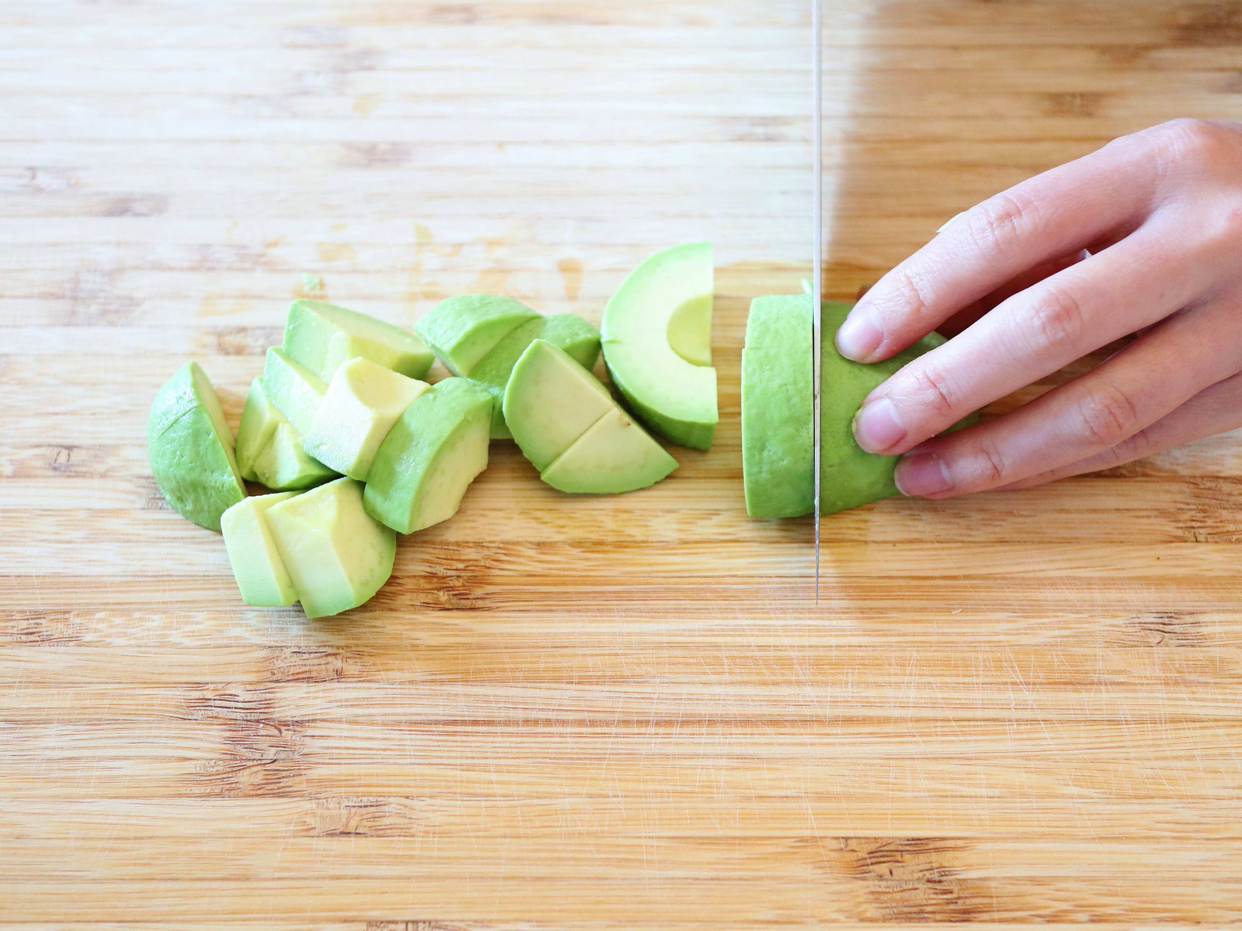 (2) アボカドは皮をむき、食べやすい大きさにカットする。