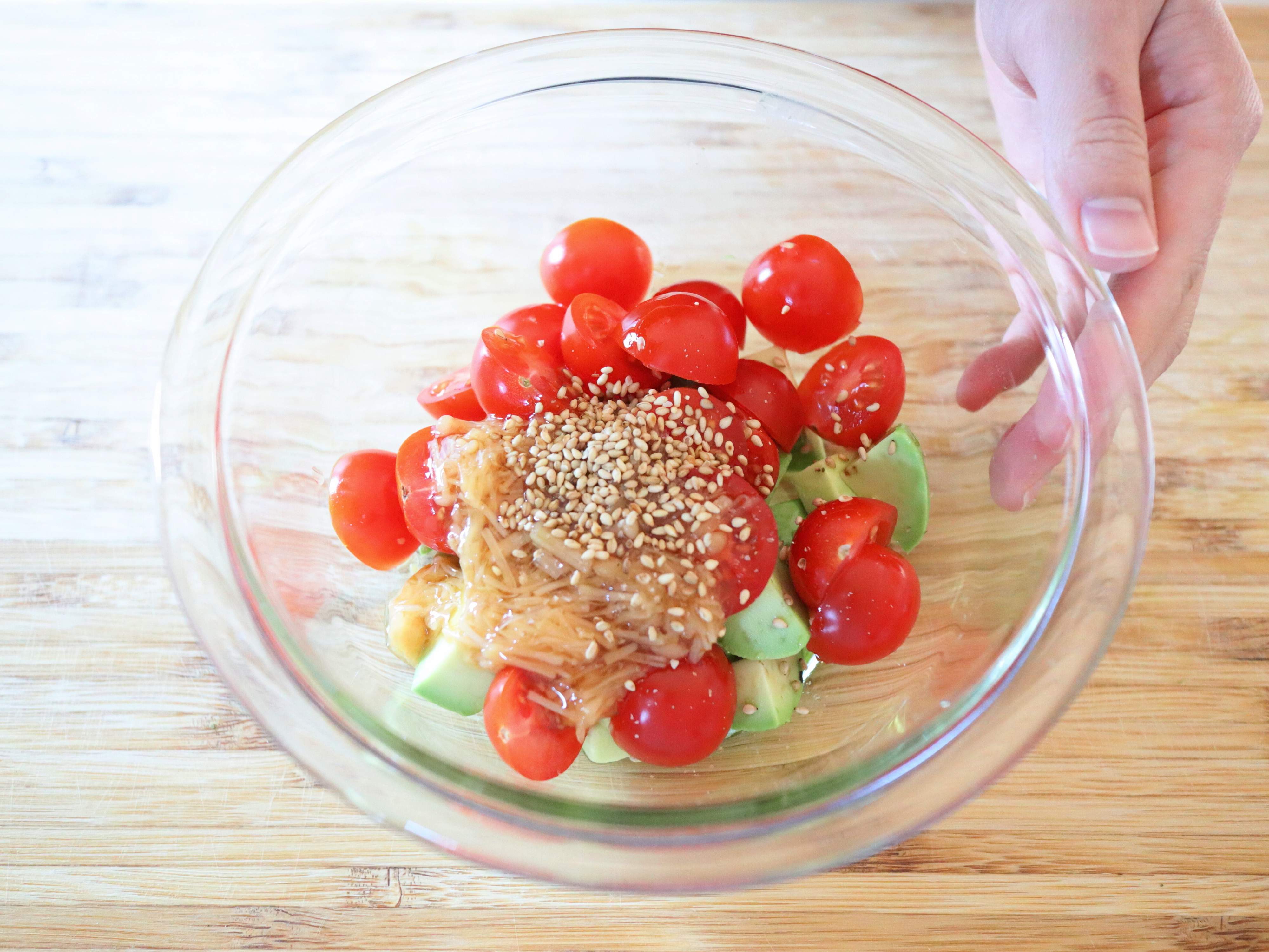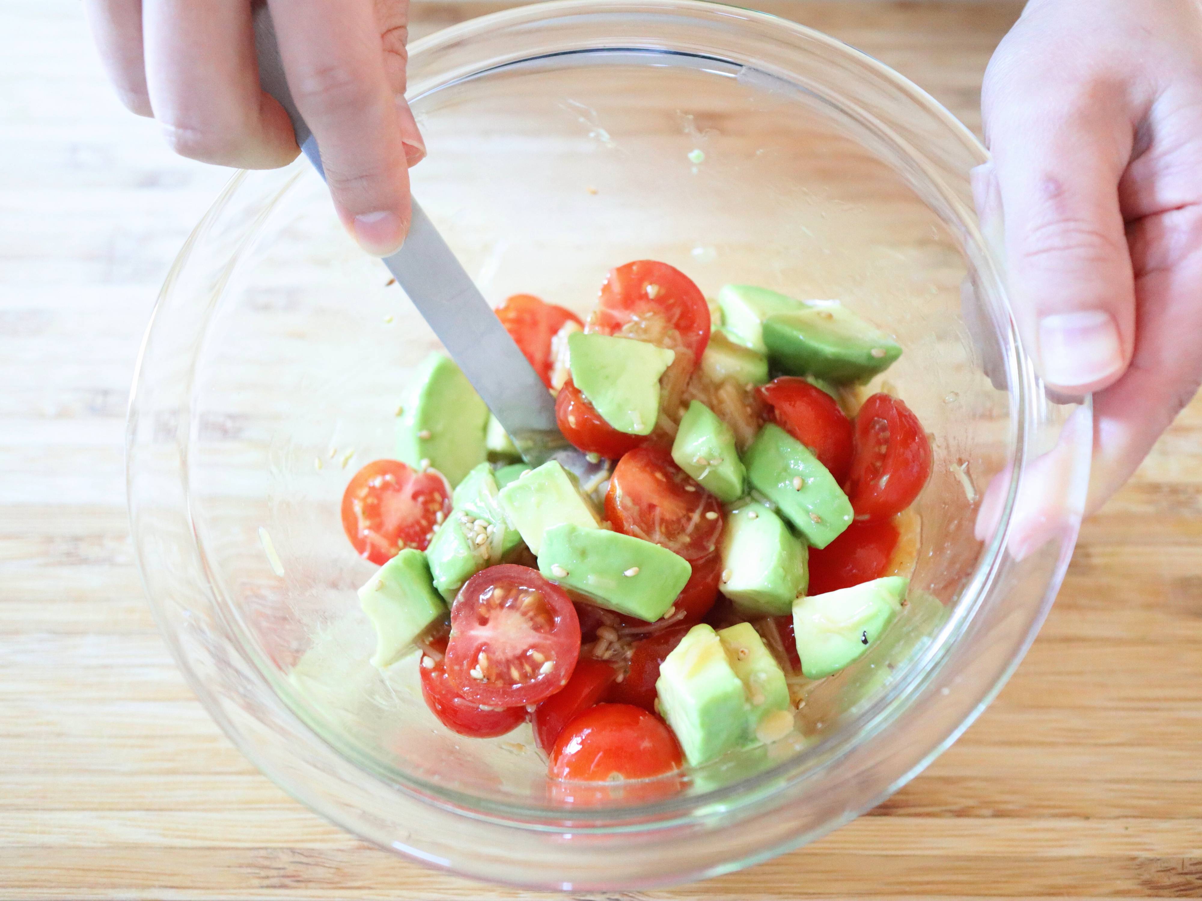 (3) ボウルにカットしたミニトマトとアボカド、残りの材料すべてを入れる。