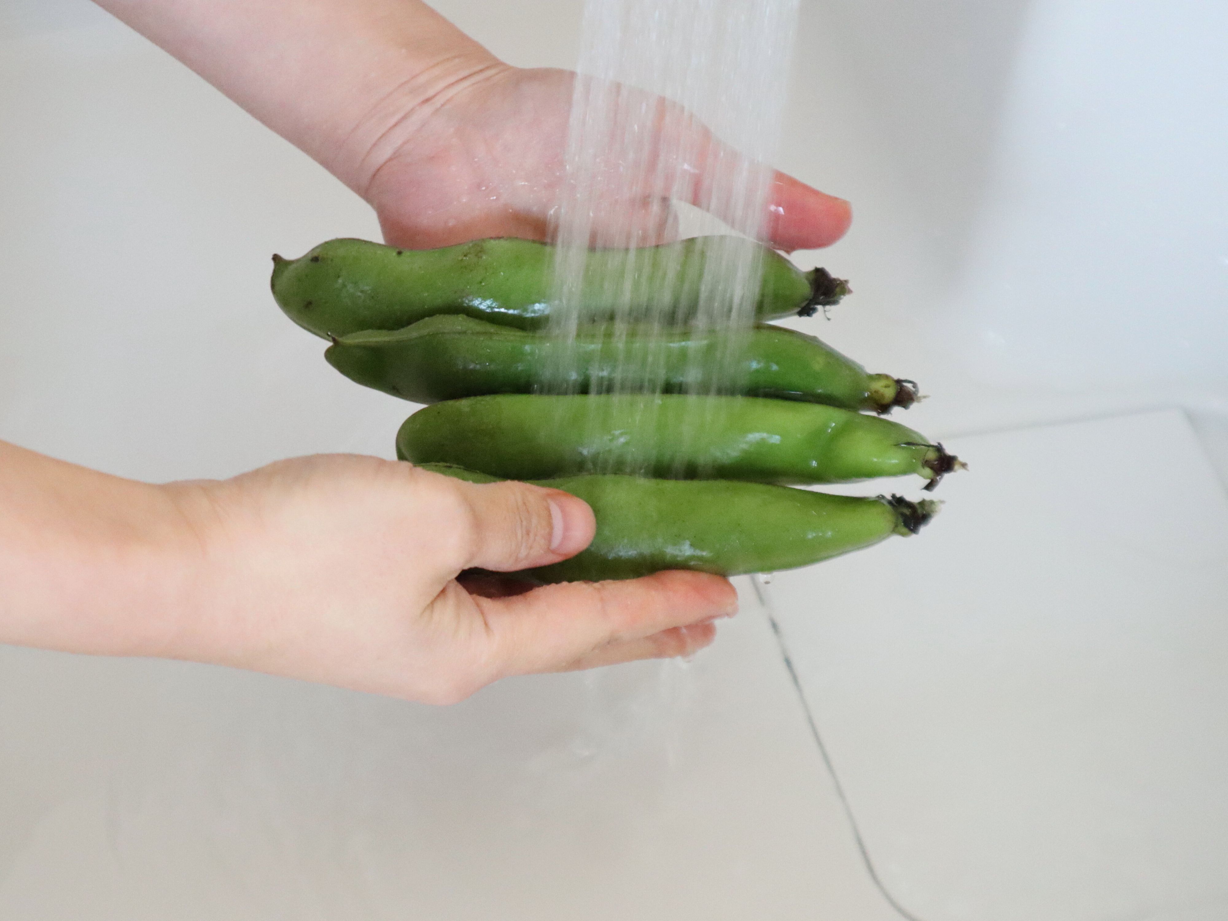 (1) そら豆はさやの表面をサッと水洗いする。