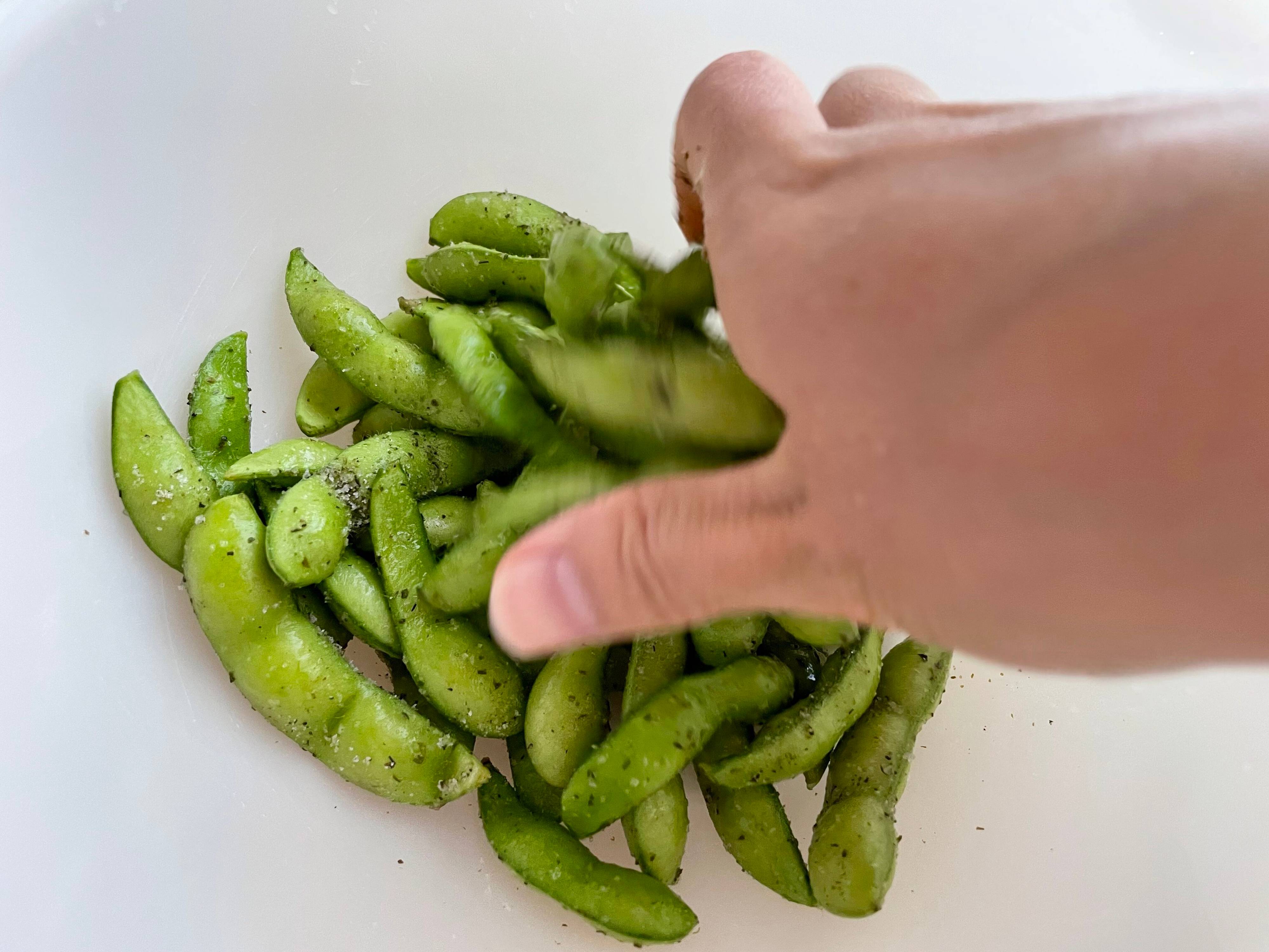 (1) 枝豆はサッと水洗いしたら、塩と黒こしょうを揉み込む。