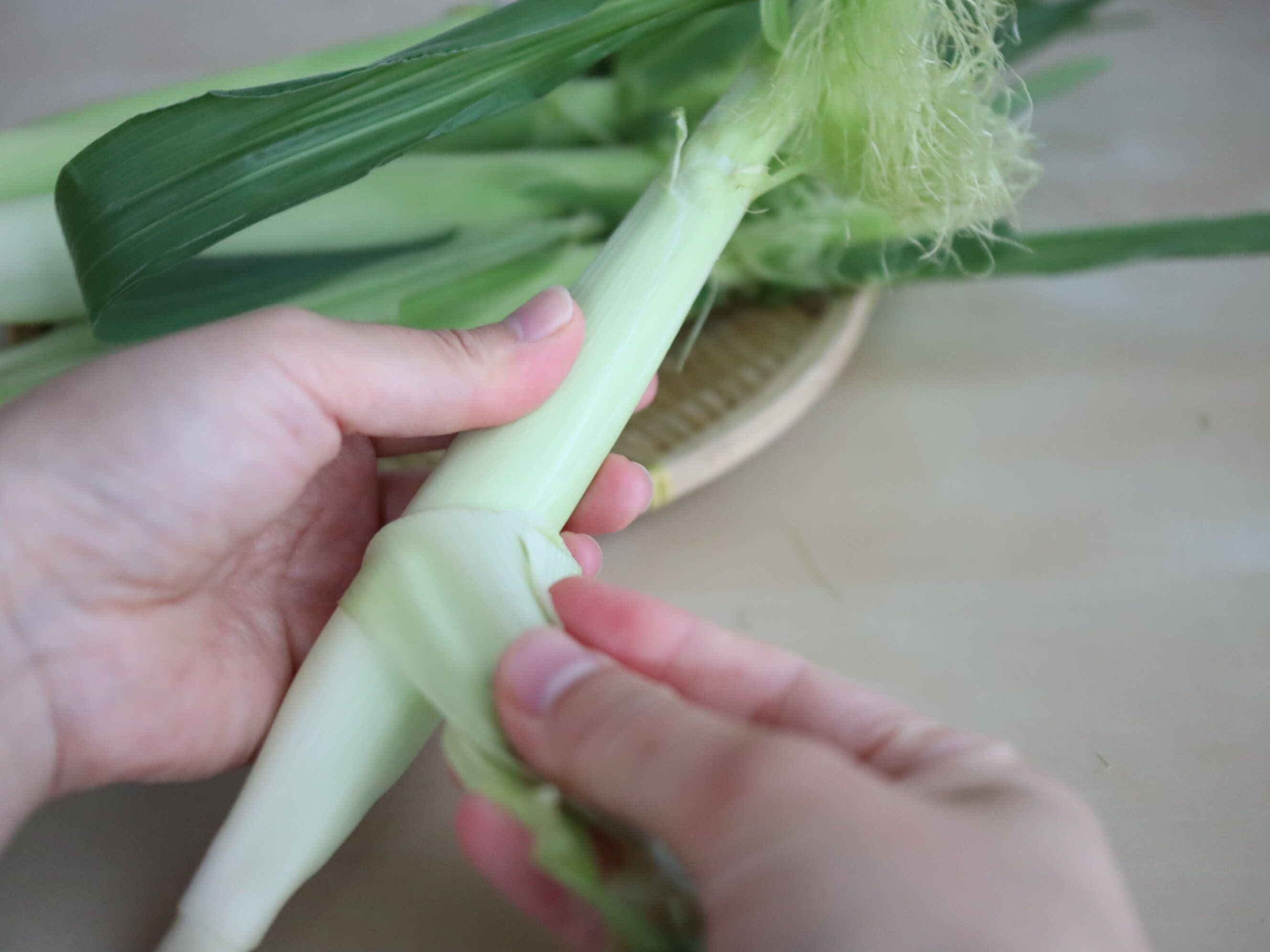 【1】ヤングコーンは外側の皮を3〜4枚むく(色の濃い皮だけをむき、薄い皮は残しておく)。