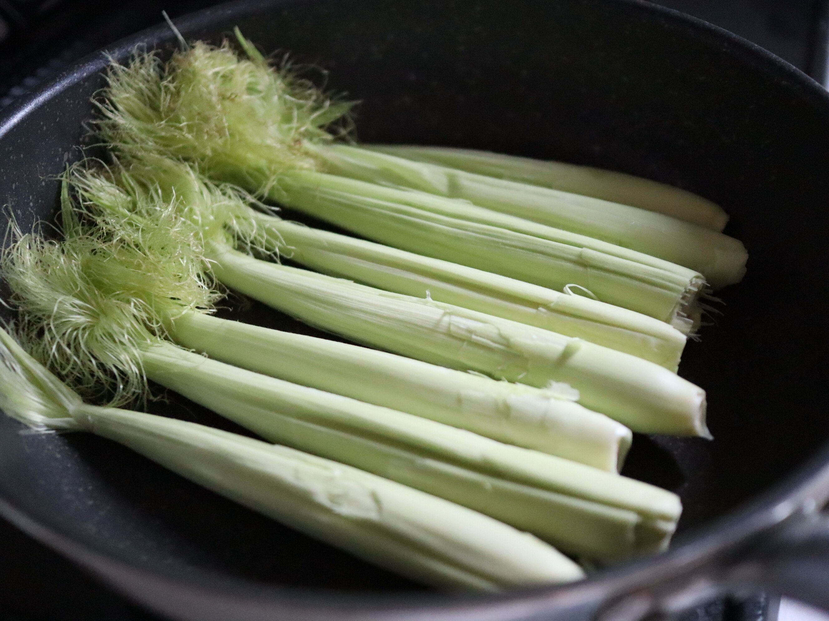【2】ひげが底に触れないようにフライパンに並べる。まだ火はつけません。