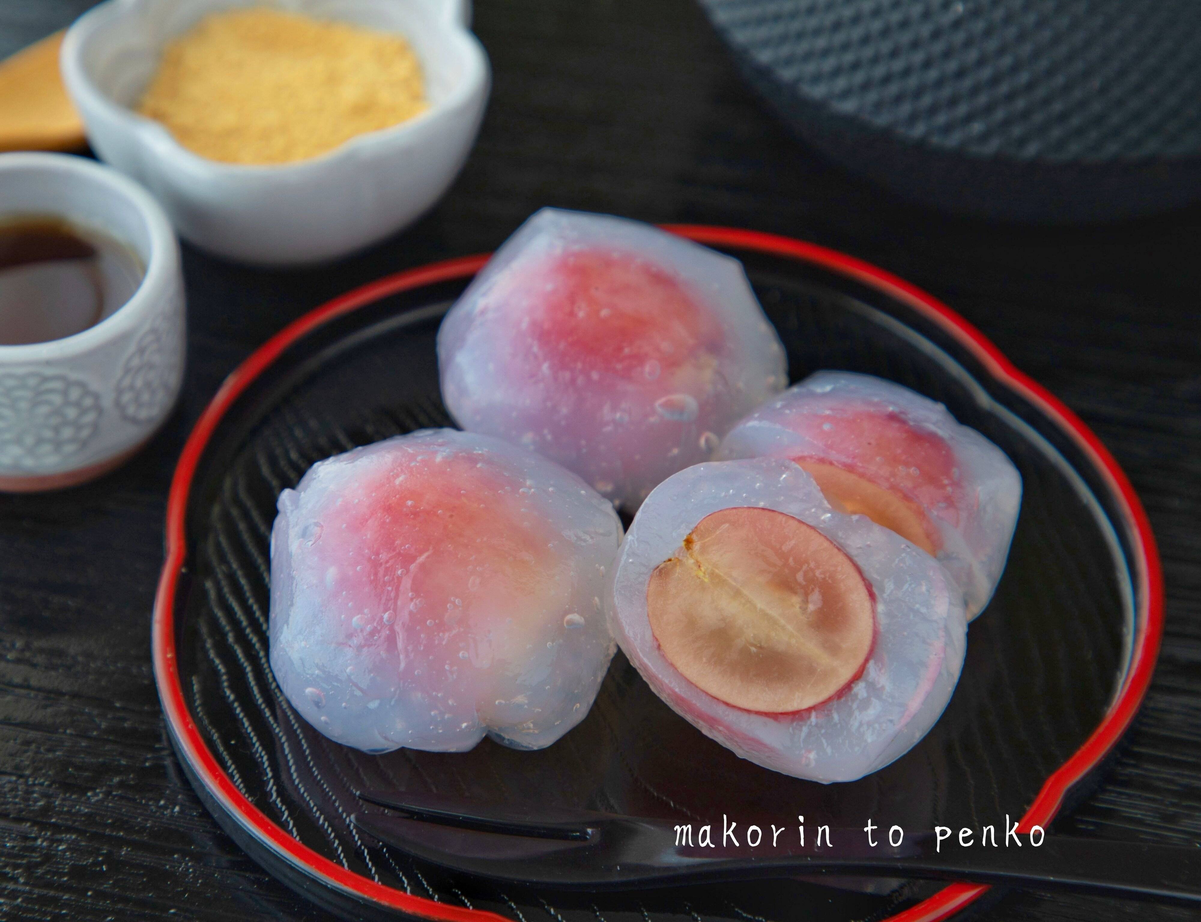 見た目も美しい、フルーツ大福に似たお菓子です。フルーツ大福とは異なり、餡を使わない、ぶどうの甘みを活かした和菓子です。甘みを加えたいときは、きな粉と黒蜜をかけたり、メイプルシロップをかけたりして調整できます。