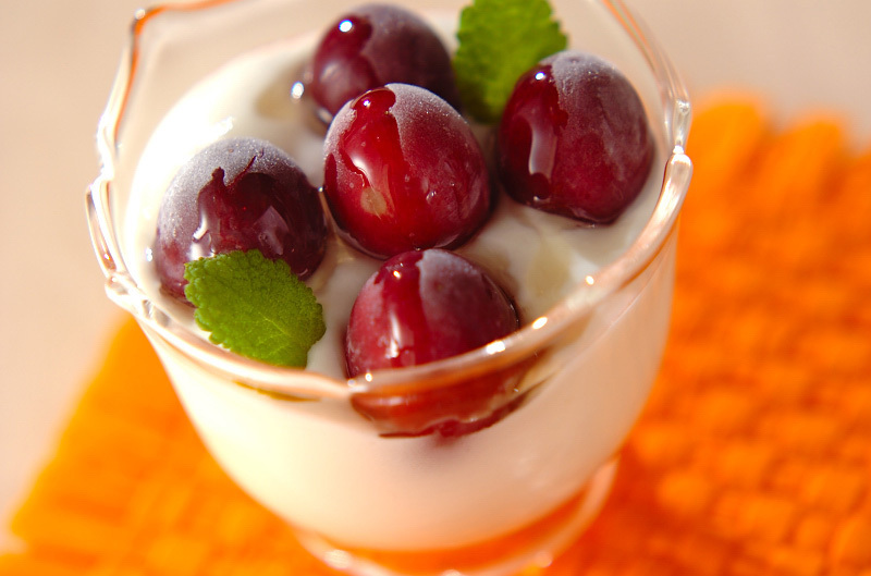 ヨーグルトに冷凍のぶどうを乗せるだけの簡単レシピです。ヨーグルトと一緒に凍ったまま食べるため、皮も食べられるタイプのぶどうがおすすめです。