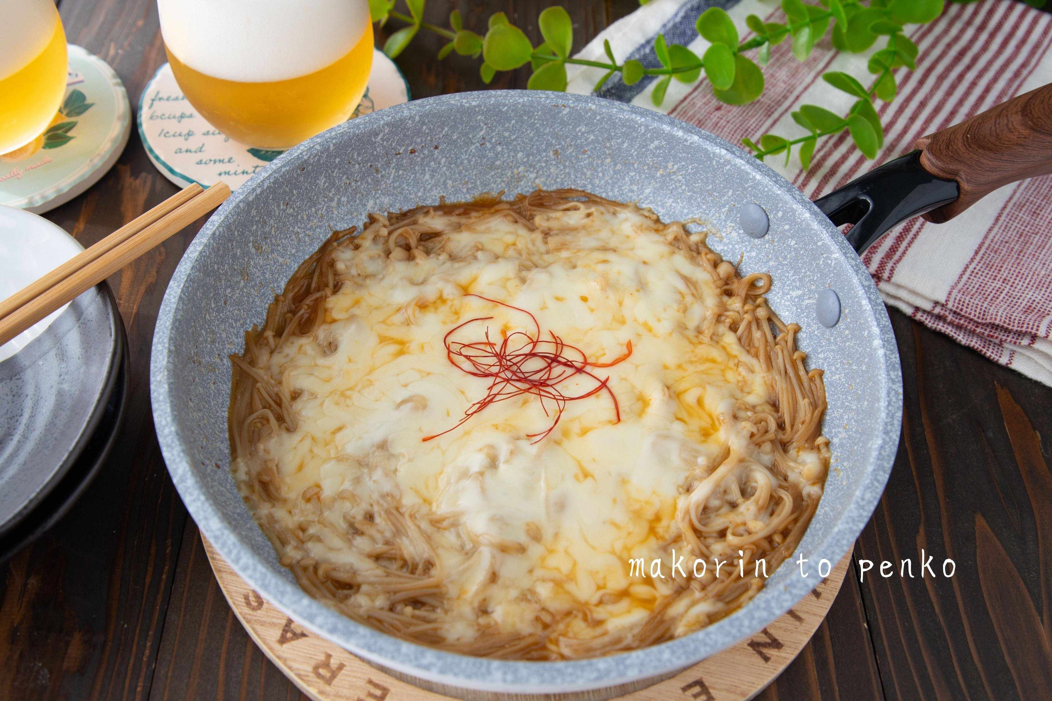 一見手の込んだ料理のようですが、えのきを炒めて調味料で味を整え、チーズがとろりと溶けるまで加熱するだけです。