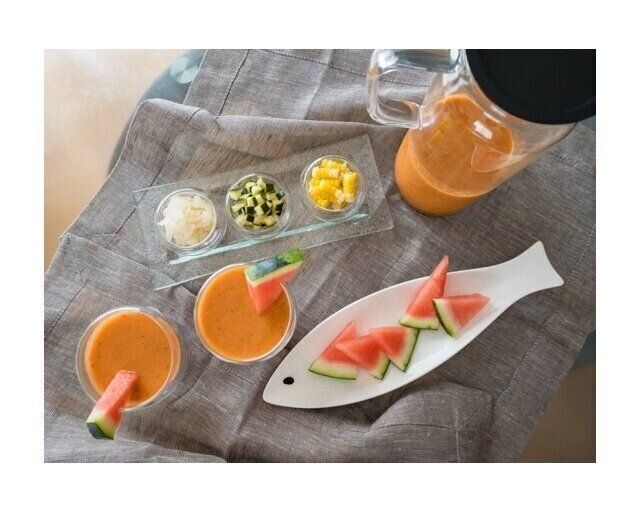 ガスパチョに「スイカ」を使うことで、ほのかな甘みが加わり、味わい深いスープになります。甘さがあるため、デザートやおやつなどにもおすすめです。
