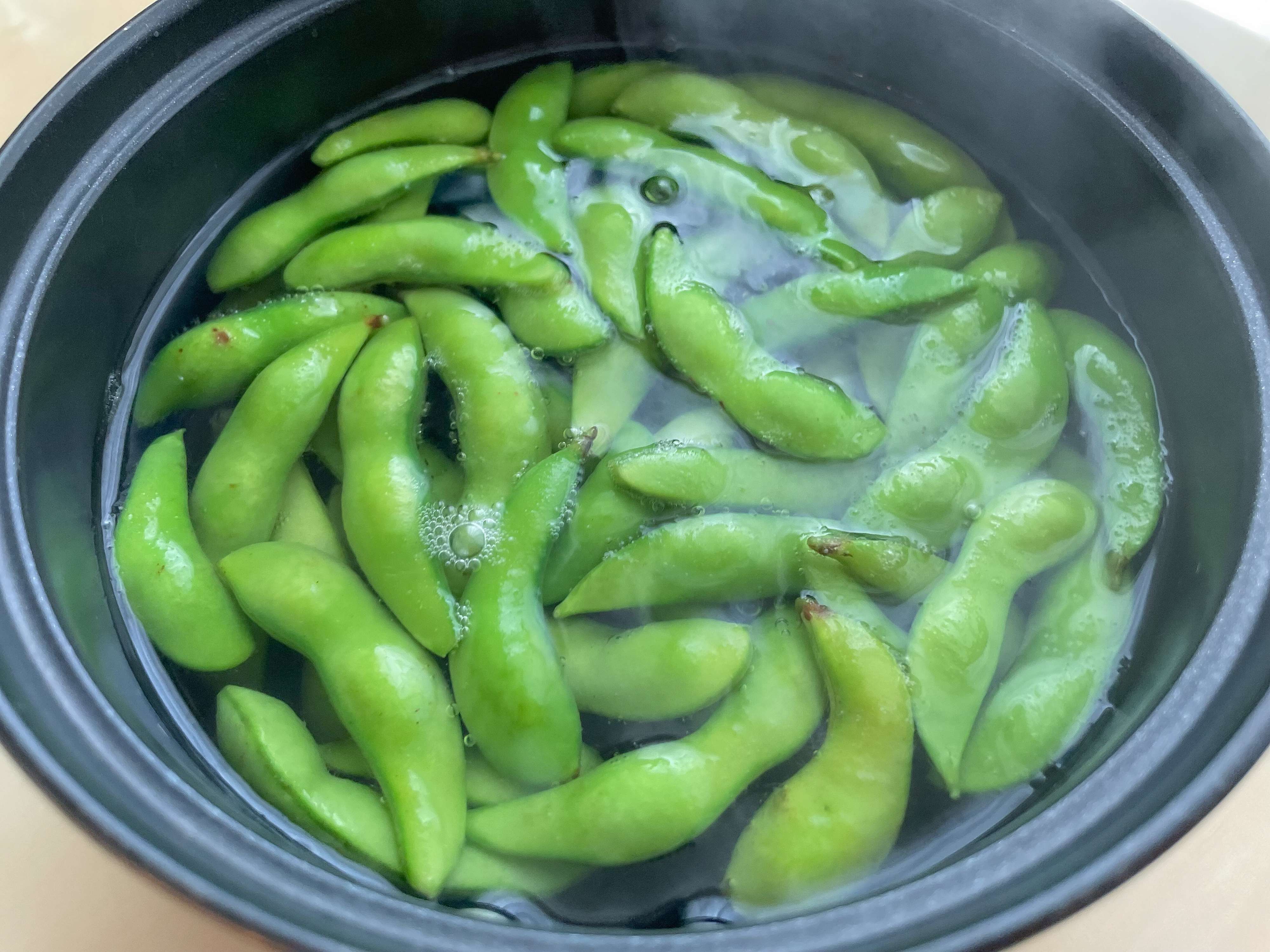 (2) 鍋に水を入れ、沸騰させたら下処理した枝豆を加えて、5分加熱する。アクが出てきたら取り除く。