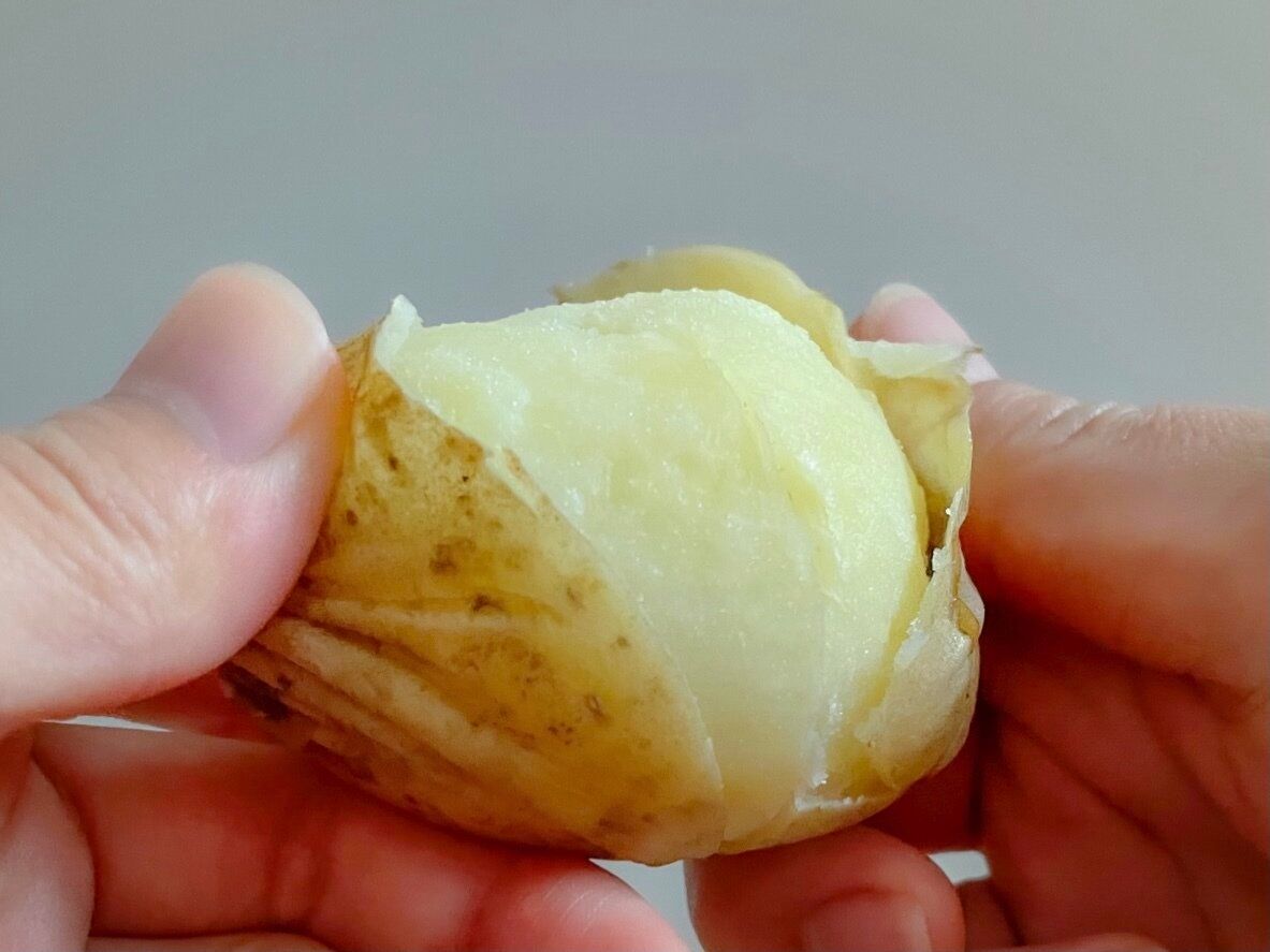 じゃがいもにはクロロゲン酸というポリフェノールも多く含まれており、特に皮や皮に近い部分ほど豊富です。ピーラーで皮をむいてしまうと実の部分まで取ってしまいますが、ご紹介の方法では、皮だけを薄くむくことができます。そうすることで、クロロゲン酸の多い皮に近い部分も食べることができます。