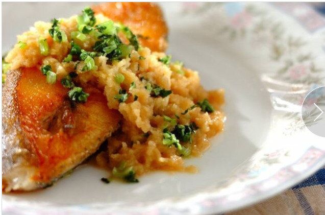 カレイのムニエルにおろしポン酢バターソースをかけた和洋風な一品です。大根の葉をソースとともに散らすことで、色鮮やかな緑が引き立ち、バターの香りとともに、食欲をそそります。