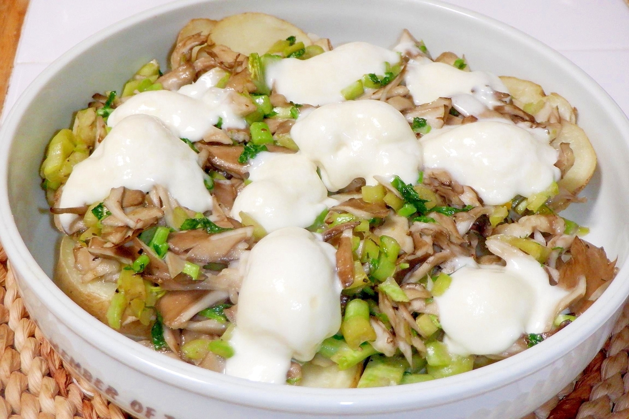 じゃがいもに大根の葉やモッツァレラチーズをトッピングして焼いた、じゃがいものマイタケバター焼きのレシピです。短時間で簡単につくれるのに手が込んで見えるので、ホームパーティやおもてなしなどにもぴったり。