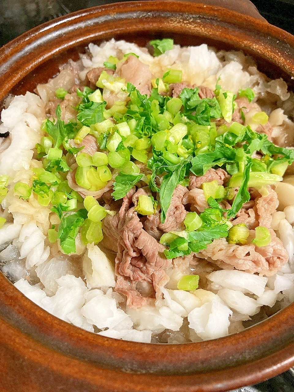 粗めの大根おろしと刻んだ大根の葉をたっぷりのせた、牛みぞれ煮のレシピです。鍋のような煮物で、満足感のあるメインになります。ポン酢といっしょに、さっぱりと食べるのがおすすめ。