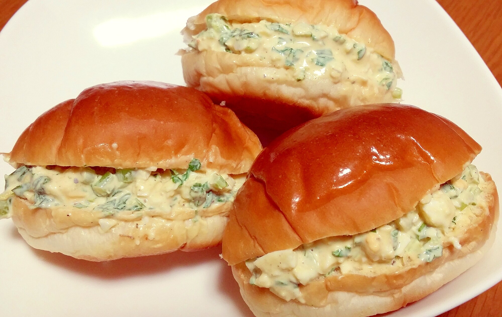 いつもの卵サンドに大根の葉をプラス。大根の葉のシャキシャキとした食感がアクセントになっています。ロールパンを使うと、食パンではさむよりも手間が少なくすみますよ。