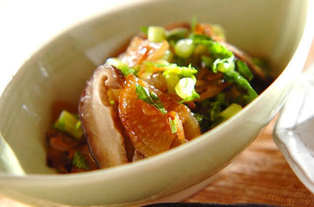 大根と桜エビの煮物を、ナンプラーでエスニック風に味つけした一品。桜エビの旨味がきいた煮物に、大根の葉で見た目と食感のアクセントを加えています。いつもとひと味違う煮物を食べたいときにおすすめ。
