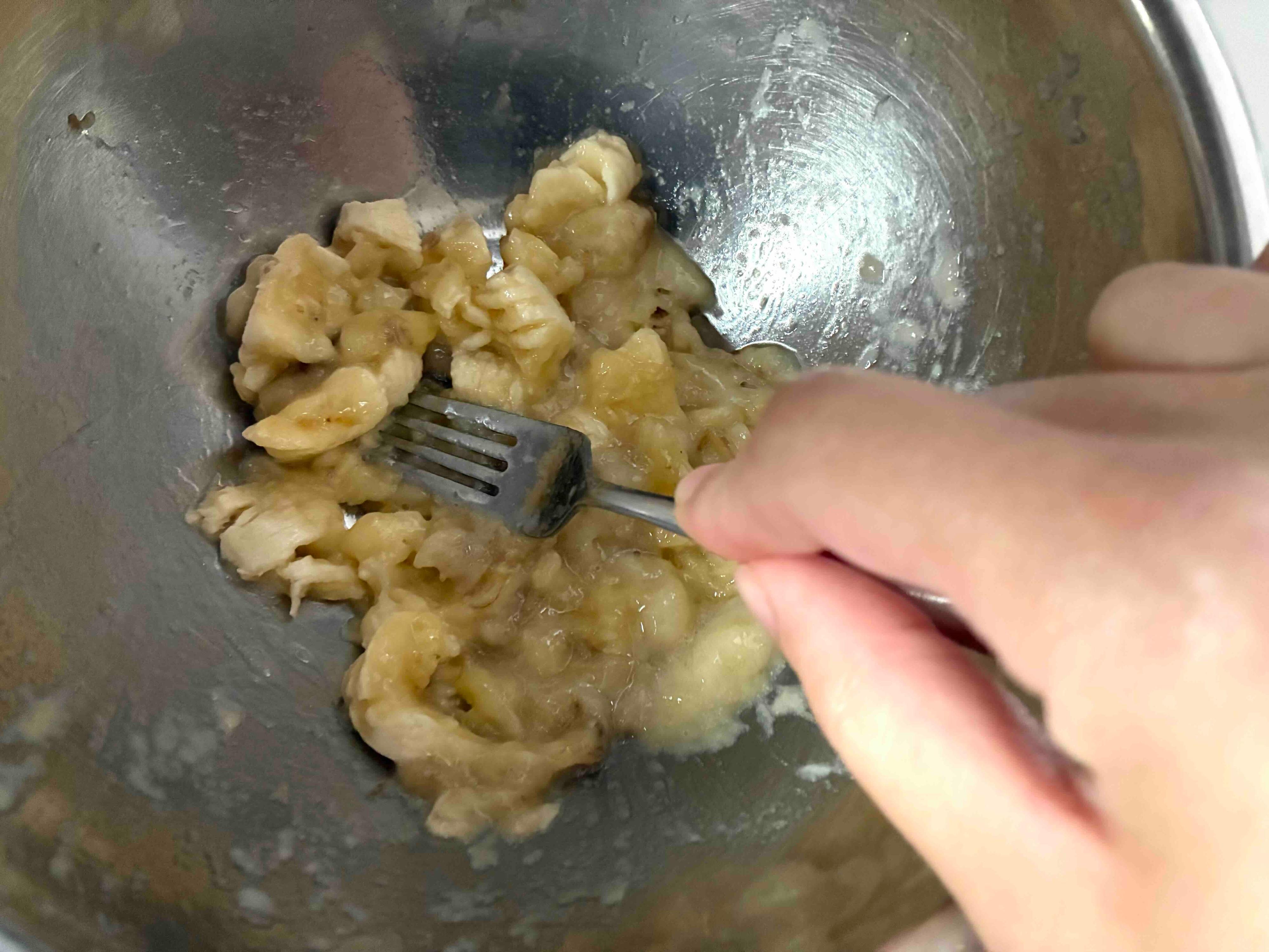 バナナはフォークで粗くつぶすのがコツ。焼き上がった後に、バナナの存在感を感じられますよ。