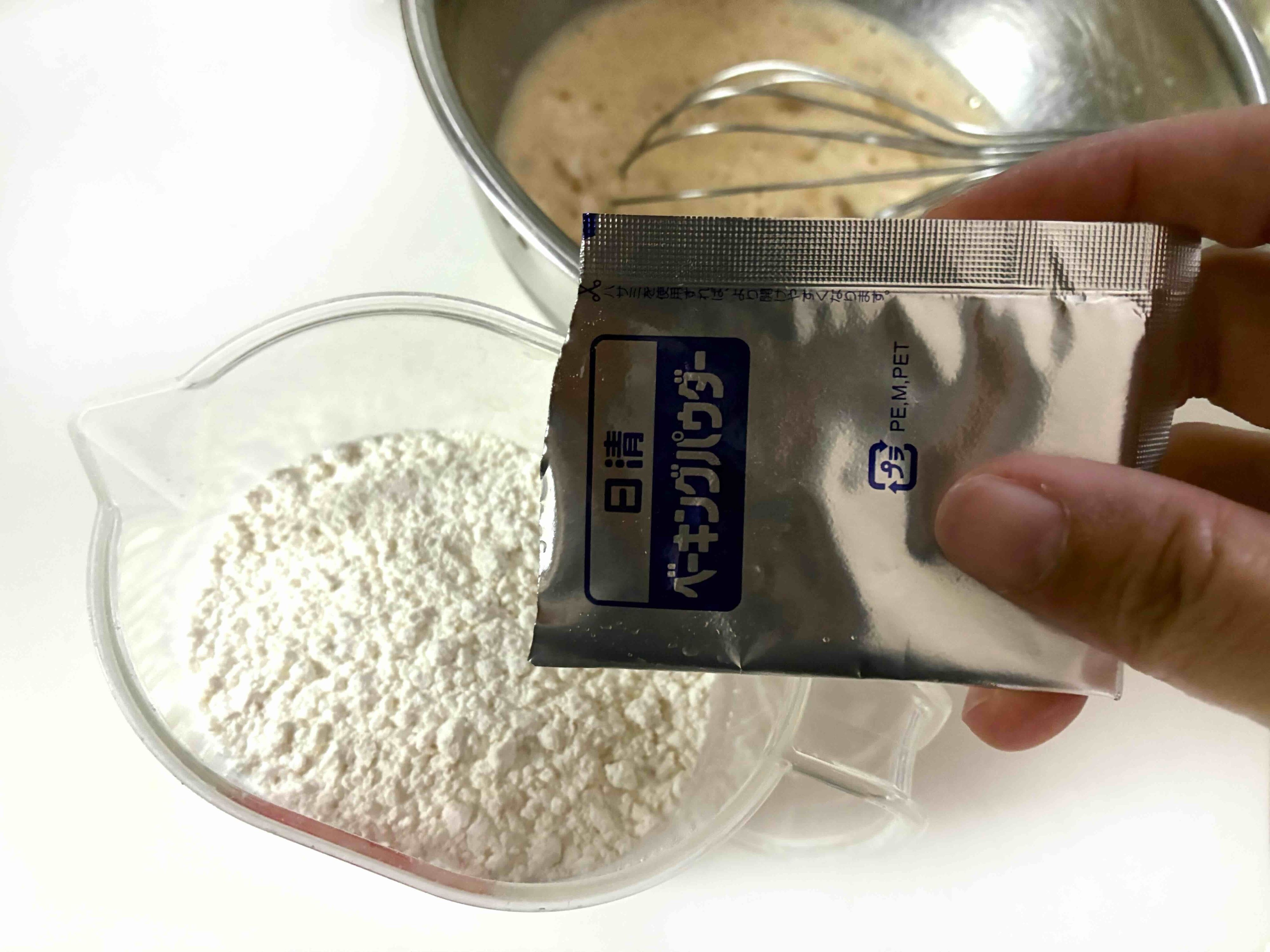 ベーキングパウダーは量った薄力粉の上に入れちゃいましょう。