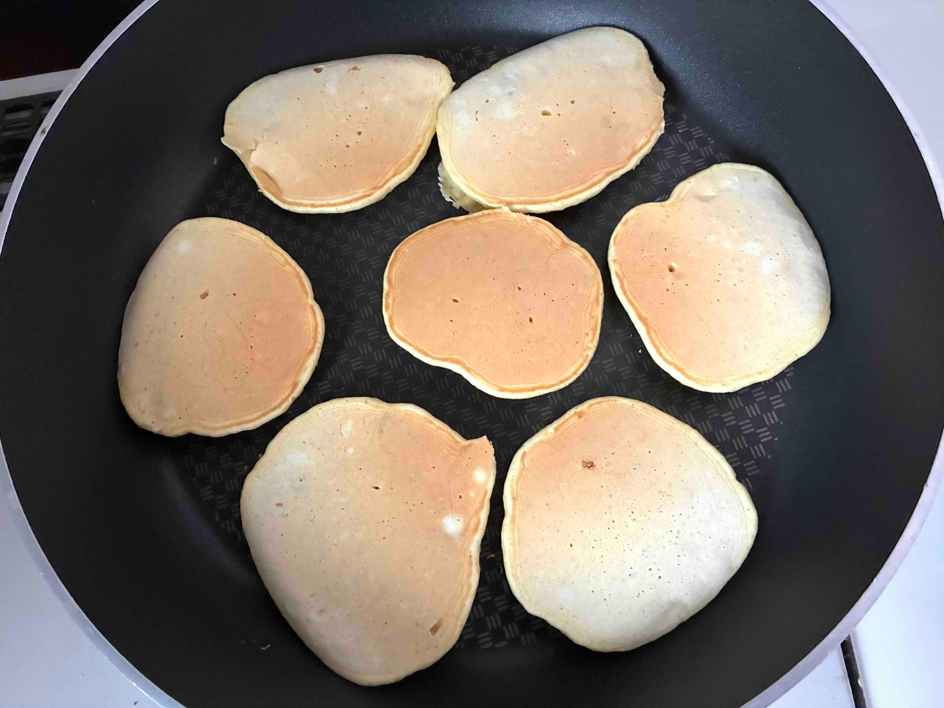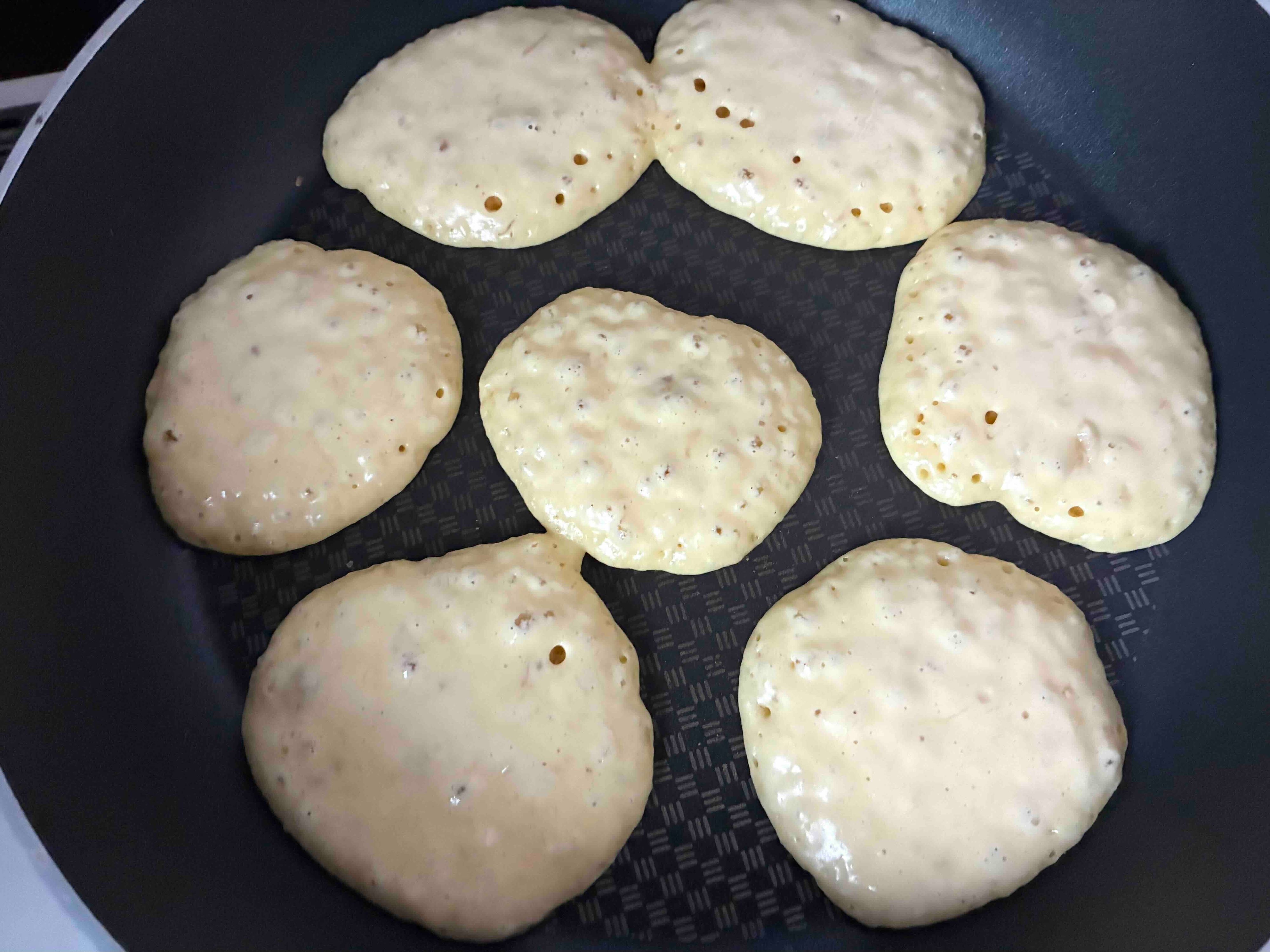 はじめ、フライパンを中火で熱しながら、お玉で生地を流し入れます。すべて入れ終わったところで弱火にし、様子を見ながら焼いていきます。生地の外側が乾燥しかけ、表面にぷつぷつと泡が見えてきたらひっくり返すタイミング。