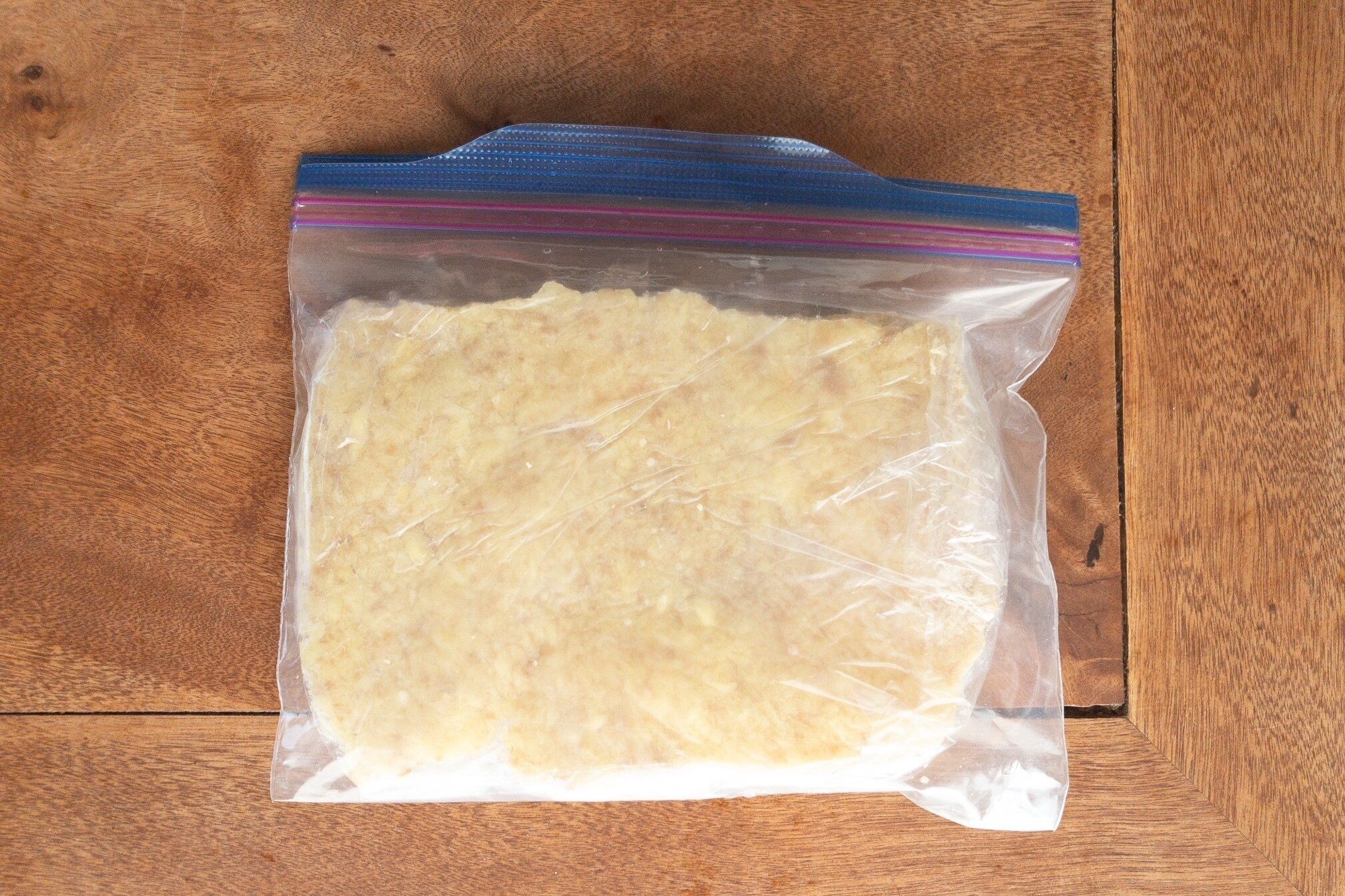 粉々になった生姜をジッパー付き袋に平らに詰めます。そして、平らな状態を保ったまま冷凍します。