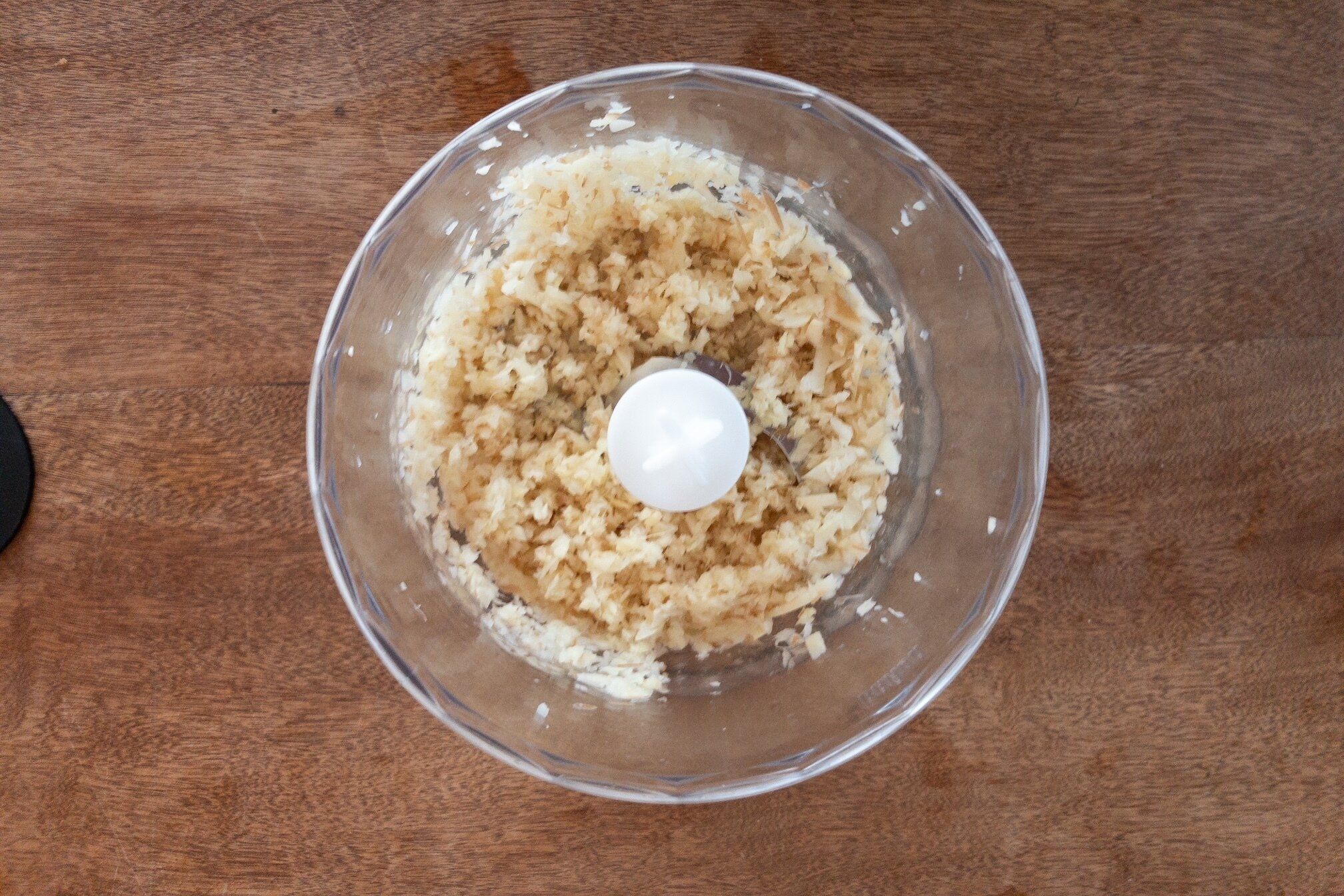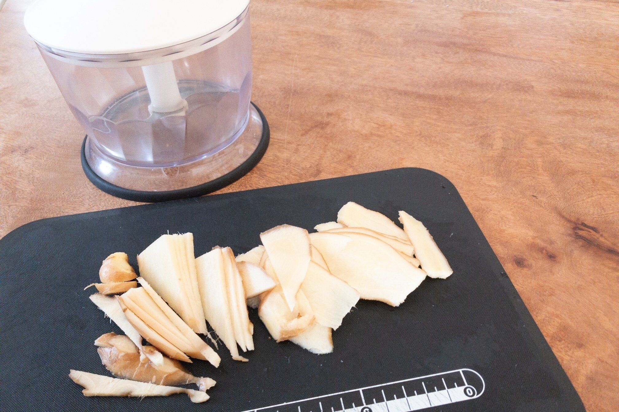 まず生姜をきれいに洗って皮つきのまま薄くスライスし、フードプロセッサーにかけます。フードプロセッサーがない場合は包丁でみじん切りや千切りにしてもよいです。