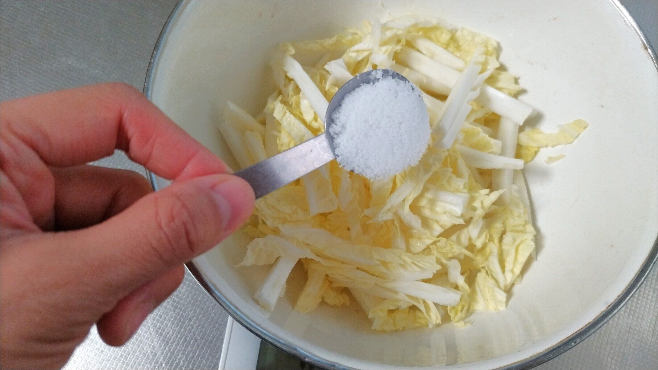 1. 白菜は芯も含めて、千切りにする。(幅の目安は5mmくらい)