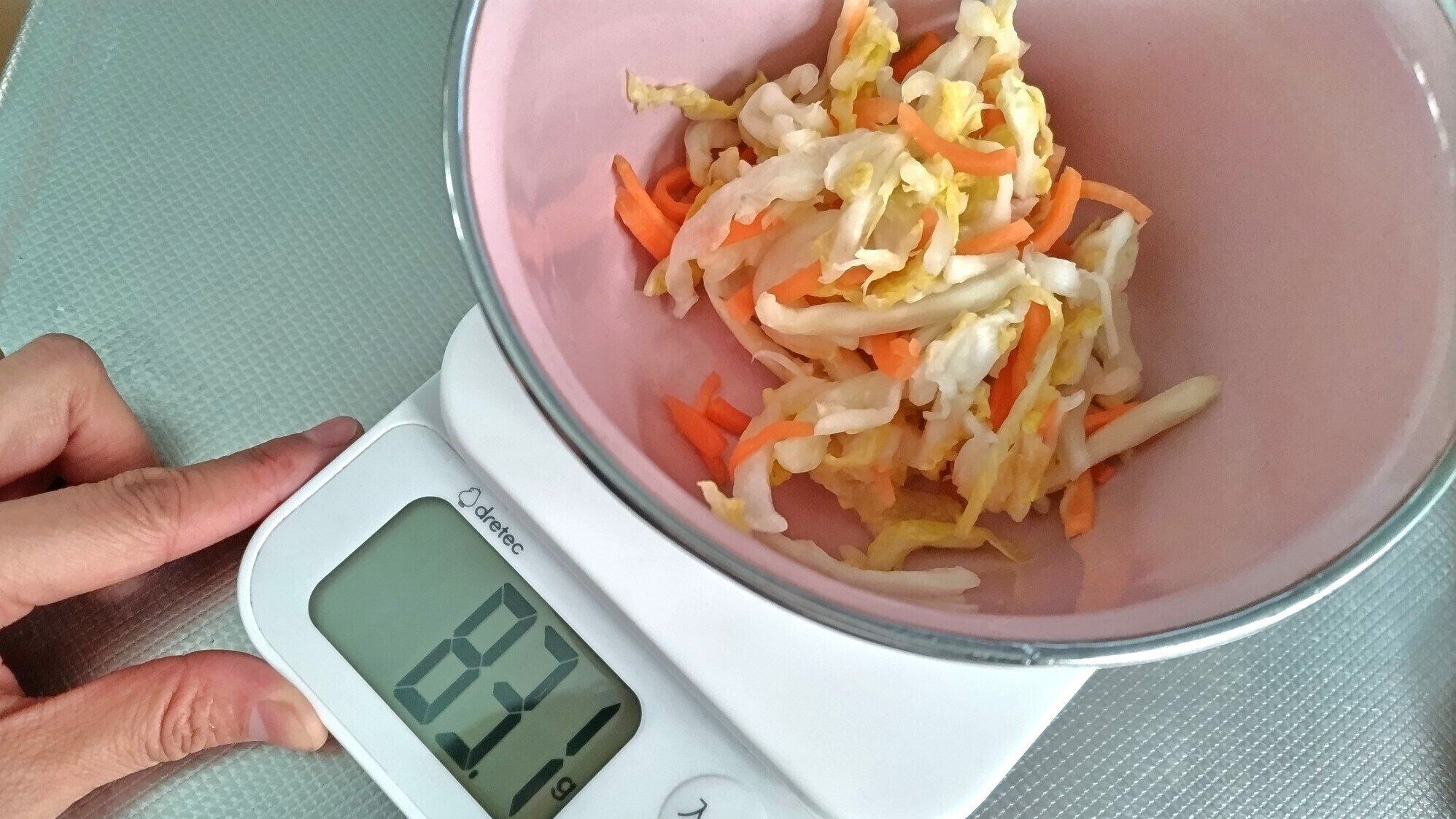 今回のレシピでは、白菜とにんじんを合わせて120g使用しましたが、ちゃんと絞ると30%も水分が抜けましたよ。