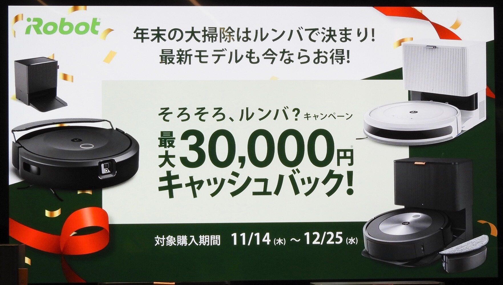 対象購入期間中に、キャンペーン対象の認定販売店、または、アイロボット公式ストア(アイロボット公式オンラインストア、楽天市場店、Yahoo!店)で対象商品を購入し、期限までに応募すれば、各対象商品に応じた金額(3万円、2万円、1万円)が銀行振込にてキャッシュバックされる「そろそろ、ルンバ?キャンペーン」の開催が決定!