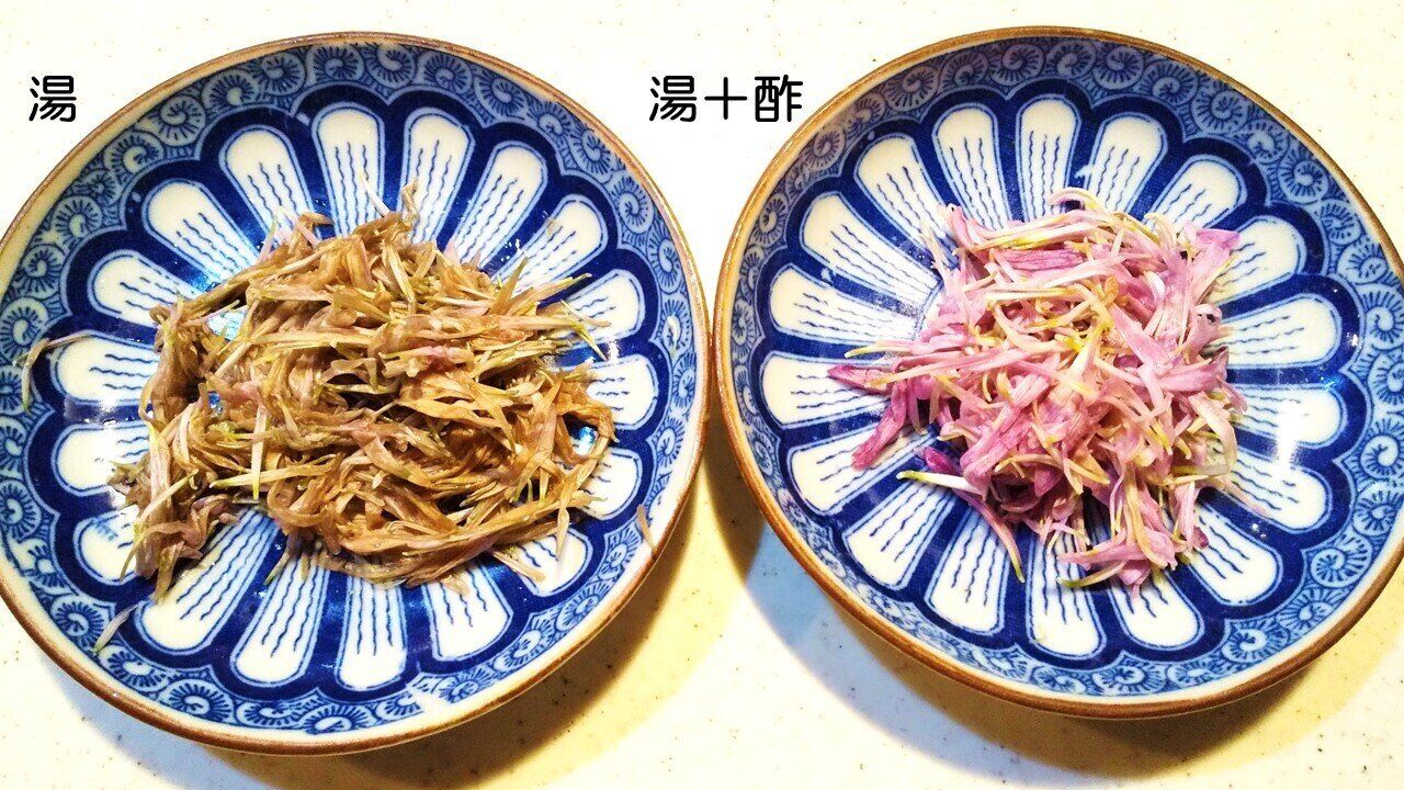 がくをつまみながら花びらを引き抜いて外し、酢を加えずに湯だけでゆでたものと、酢を加えたものを比べてみると……