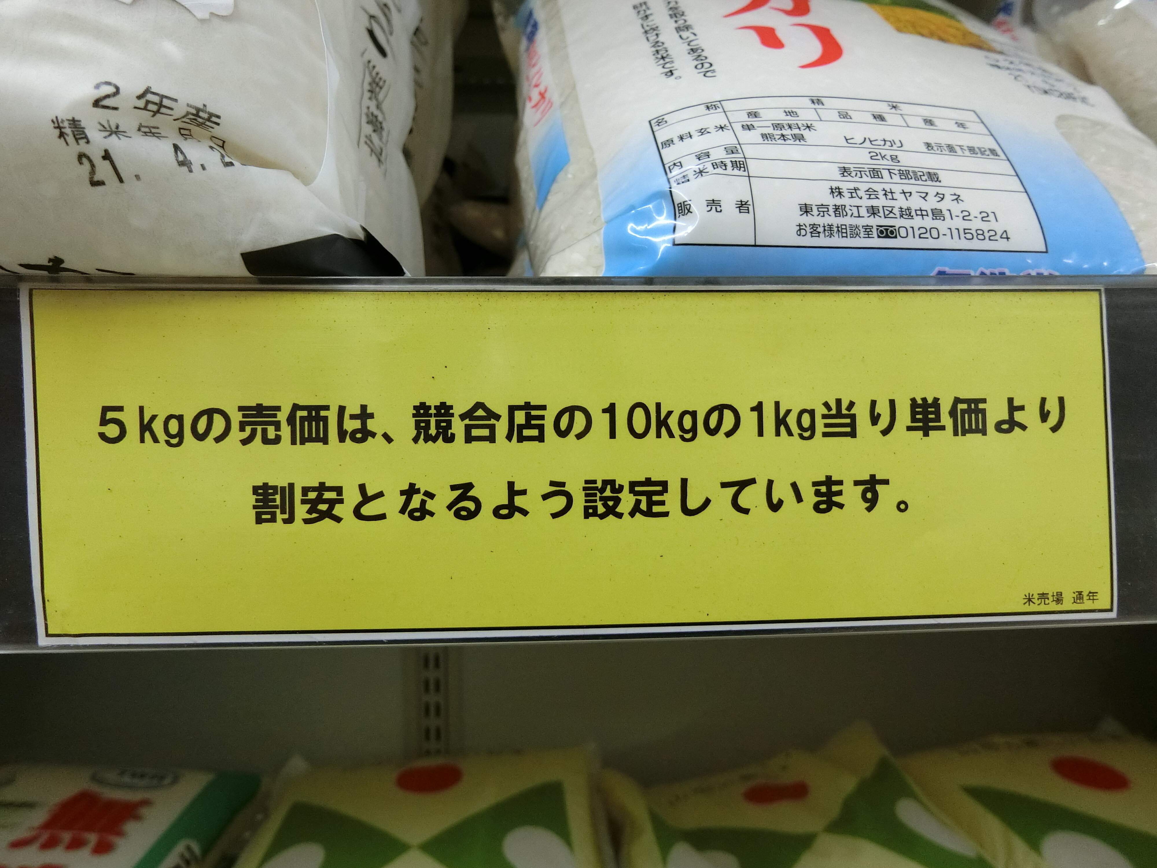 「5kgの売価は、競合店の10kgの1kg当り単価より割安となるよう設定しています。」とのこと。お米も精米からは早く食べきった方がいいですし、少量ずつ買えるのは管理が楽です。