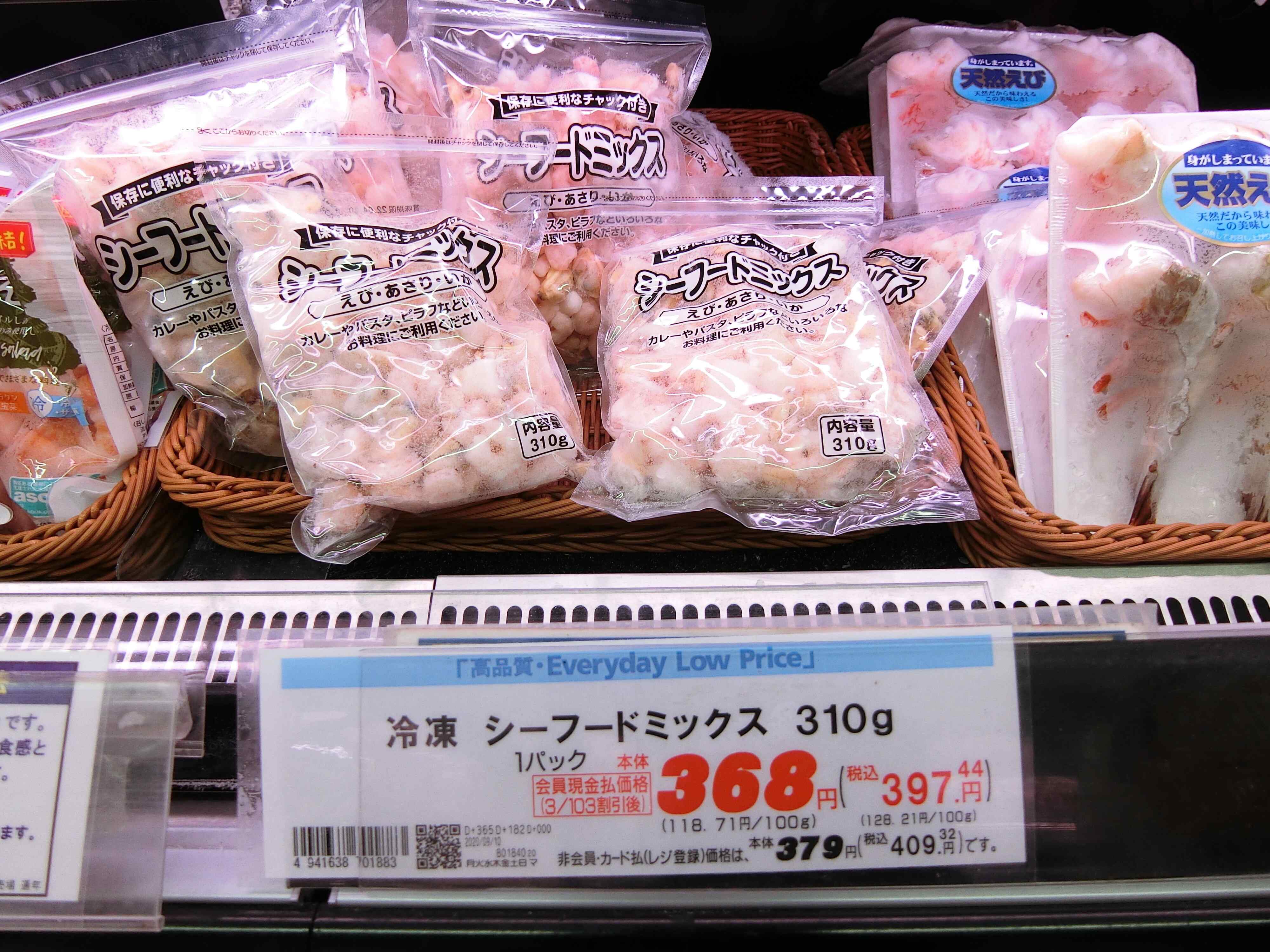 我が家がよく買うおすすめ品で、冷凍シーフードと冷凍エビがあります。冷凍シーフードは310g入って397円!シーフードパスタやピラフ、ピザのトッピングなどに使っています。