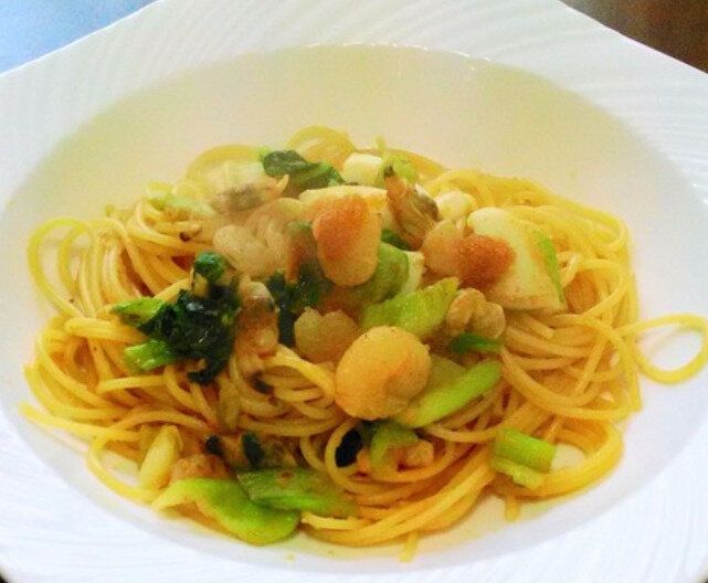 こちら、チンゲンサイとシーフードミックスで作った和風パスタ。