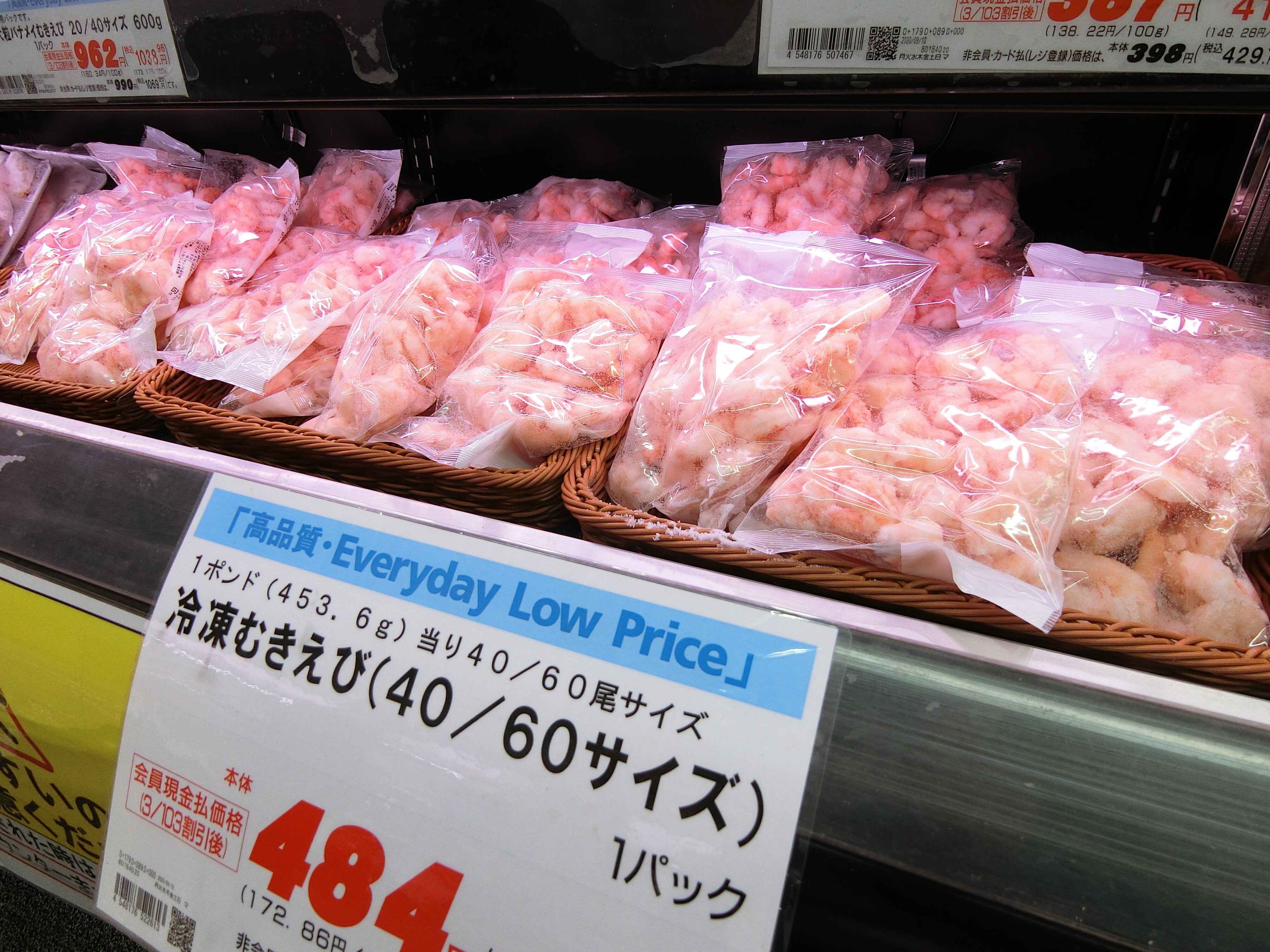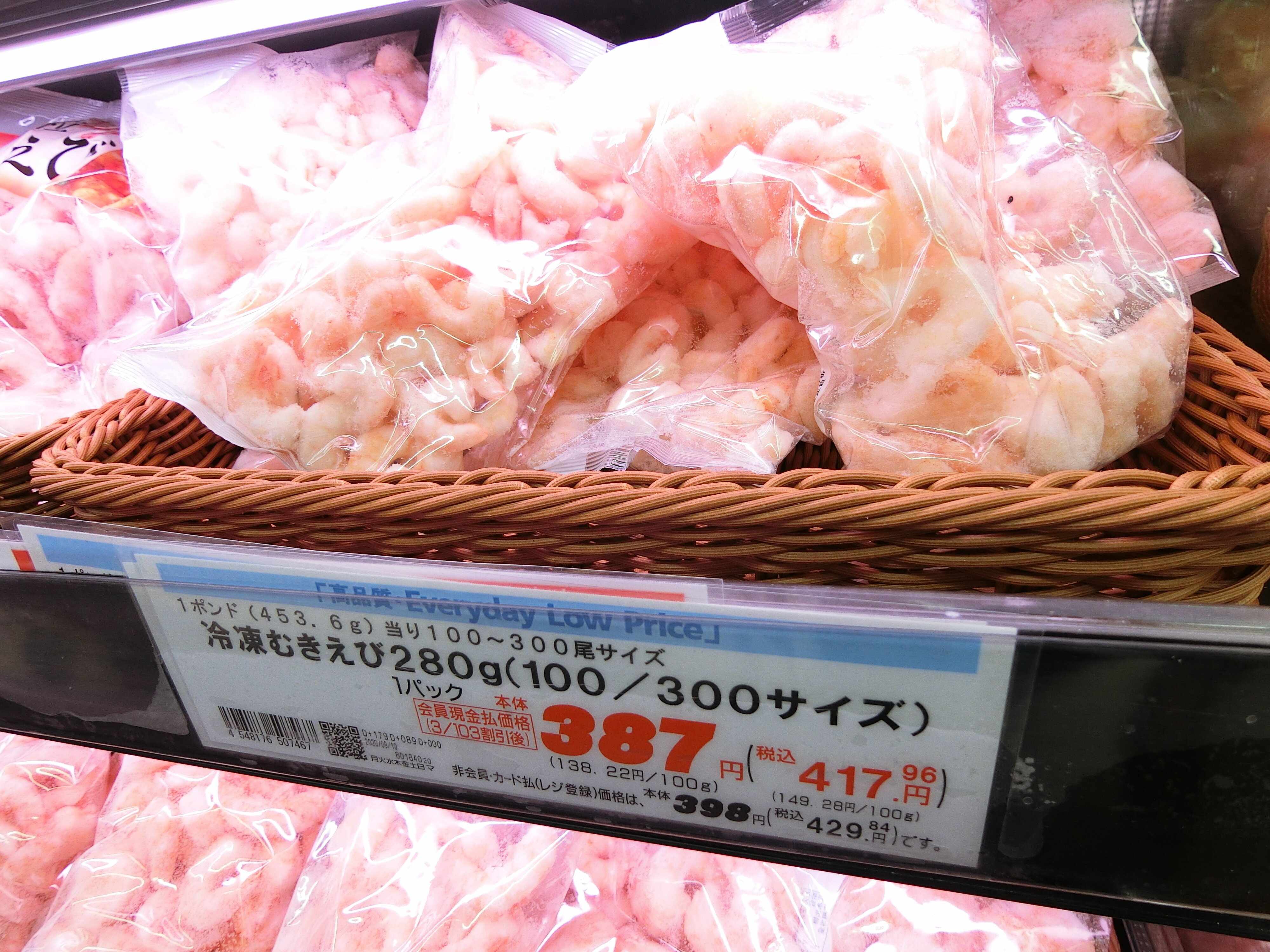 こちらは冷凍むきエビ、280g入りで417円。